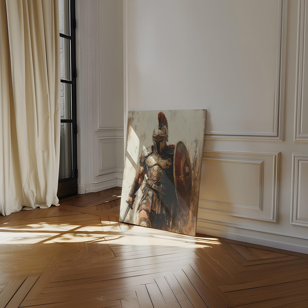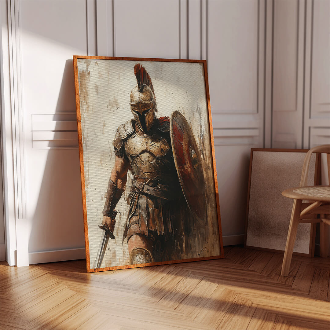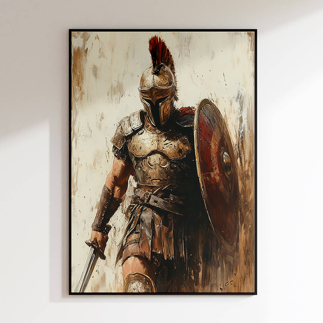 "Der Römer" verkörpert die Essenz der antiken Kriegerkultur. Mit seinem detailliert dargestellten Schild, der imposanten Rüstung und dem entschlossenen Blick zeigt dieses Motiv die unerschütterliche Entschlossenheit eines römischen Soldaten. Die dynamische Darstellung und die erdigen Farben machen dieses Motiv zu einem kraftvollen Statement für jeden Raum.