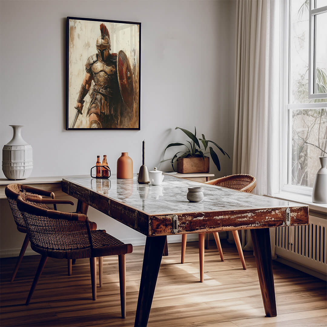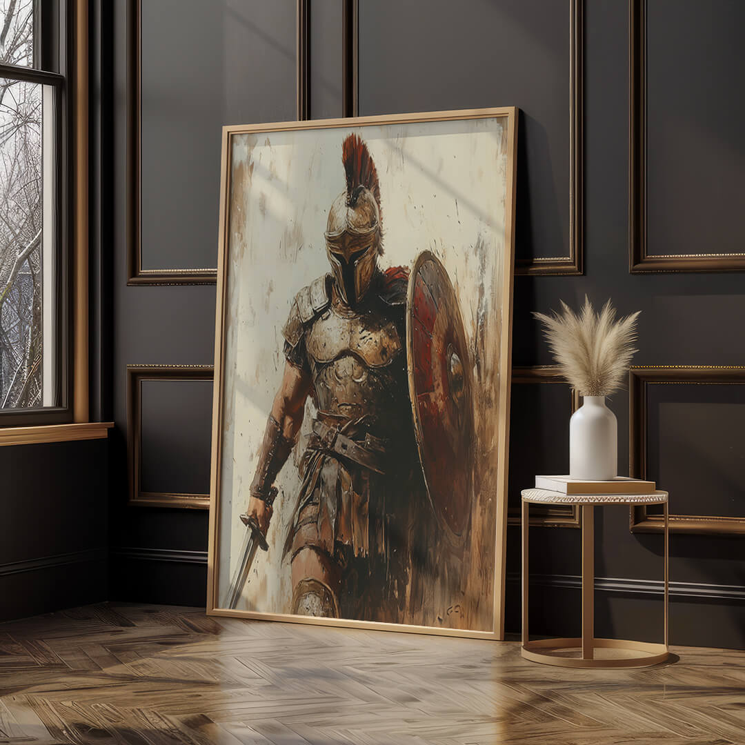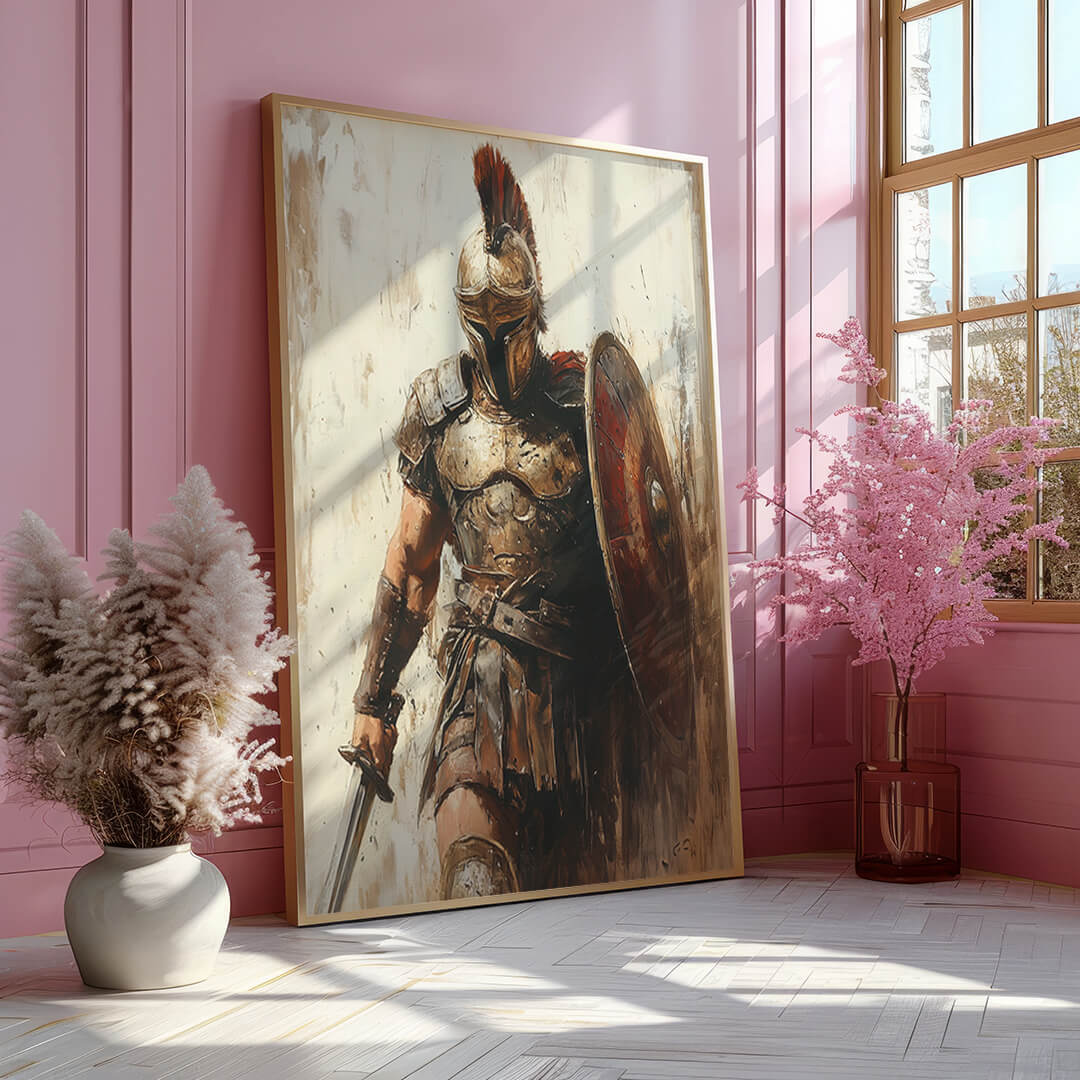 "Der Römer" verkörpert die Essenz der antiken Kriegerkultur. Mit seinem detailliert dargestellten Schild, der imposanten Rüstung und dem entschlossenen Blick zeigt dieses Motiv die unerschütterliche Entschlossenheit eines römischen Soldaten. Die dynamische Darstellung und die erdigen Farben machen dieses Motiv zu einem kraftvollen Statement für jeden Raum.