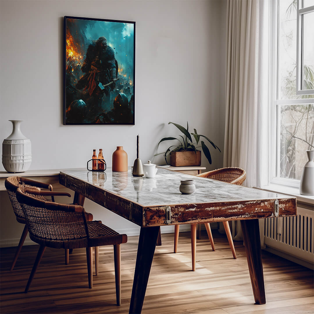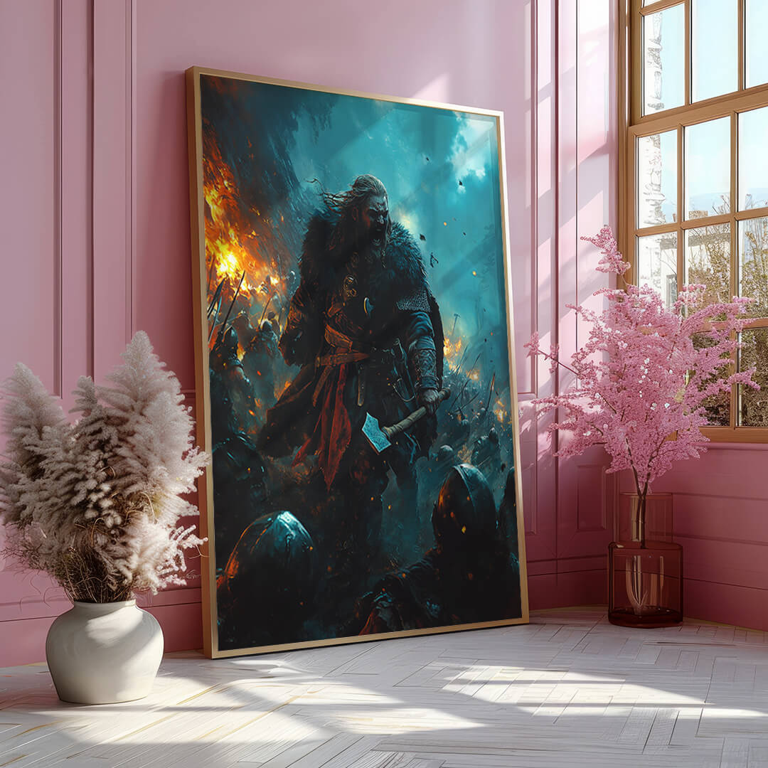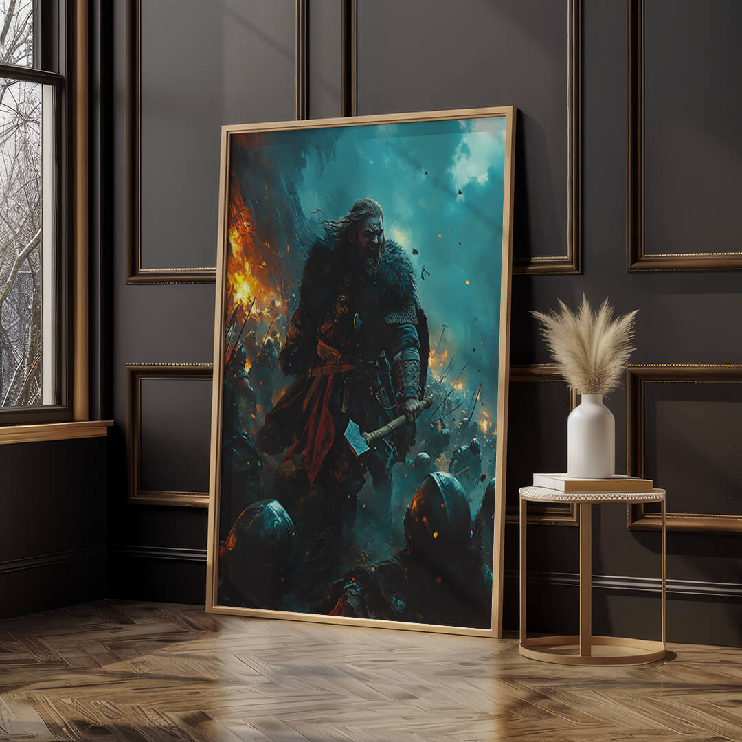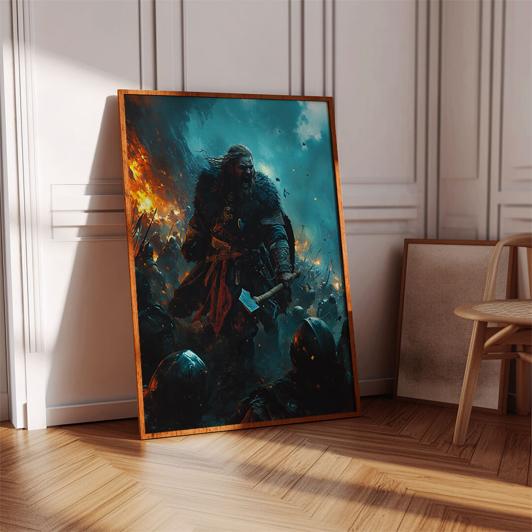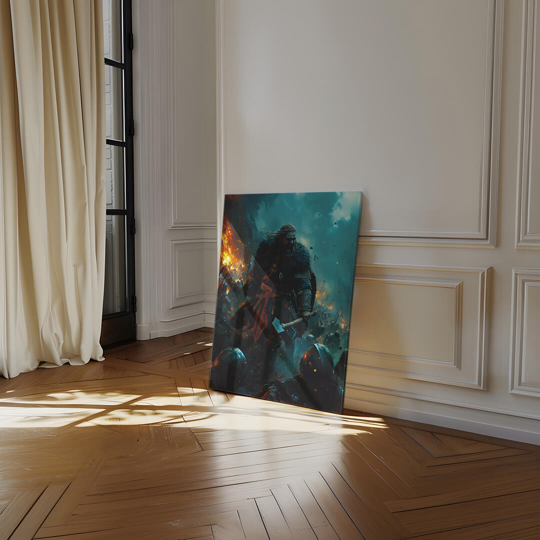 Wenn die Erde bebt und der Himmel brennt, führt „Feuer und Stahl“ seine Krieger in die Schlacht. Mit erhobener Axt und brennender Wut in den Augen stürzt dieser Wikingeranführer unaufhaltsam nach vorn. Das Chaos tobt um ihn herum, Flammen und Schwerter prallen aufeinander, doch er bleibt das Herz der Schlacht – ein Symbol für rohe Kraft und unerschütterlichen Mut.