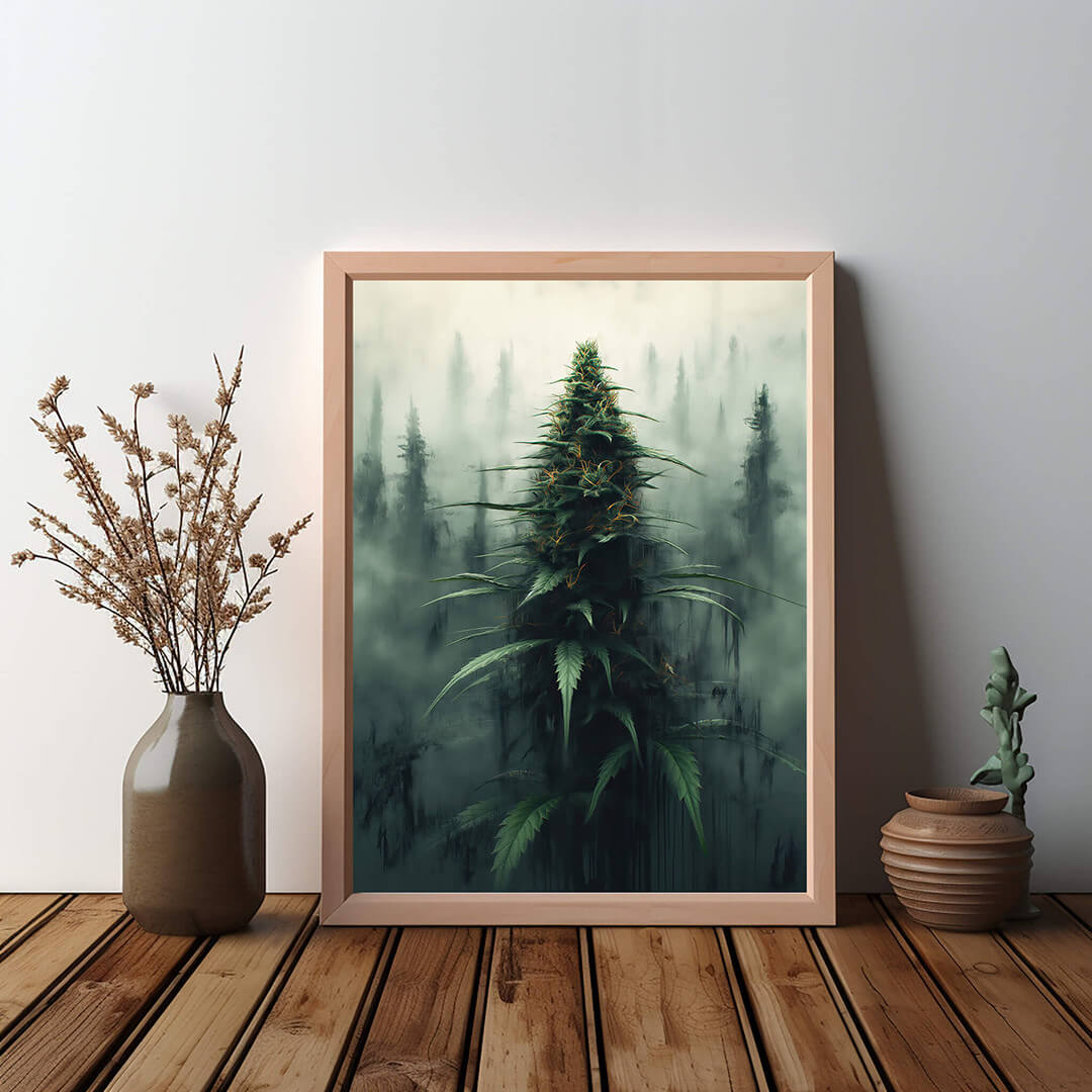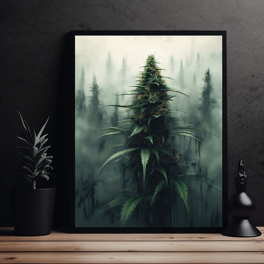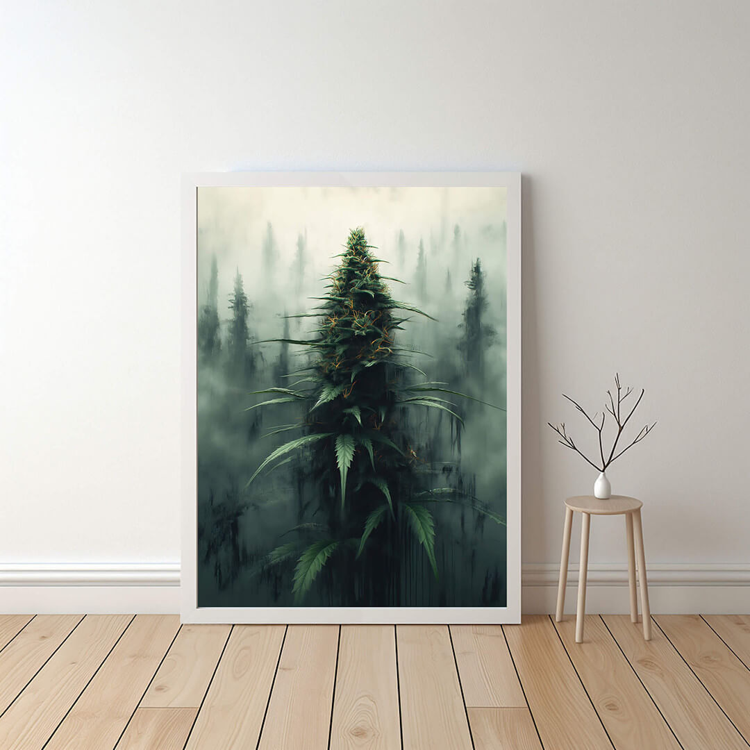 Entdecke die neblige Sphäre – ein Ort, an dem die Grenzen der Wirklichkeit sich verflüchtigen und die Natur in ihrer mystischen Pracht erblüht. Lass Dich von der majestätischen Cannabis-Blüte inmitten eines sanften Nebelmeeres verzaubern, wo jeder Blick ein Abenteuer für den Geist darstellt.
