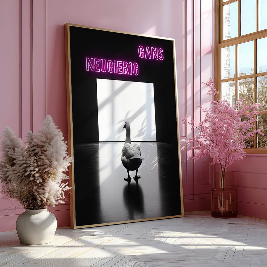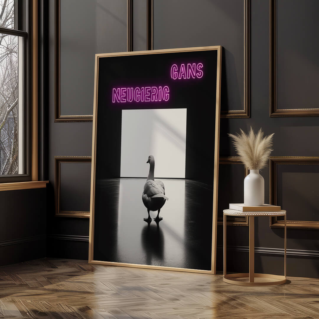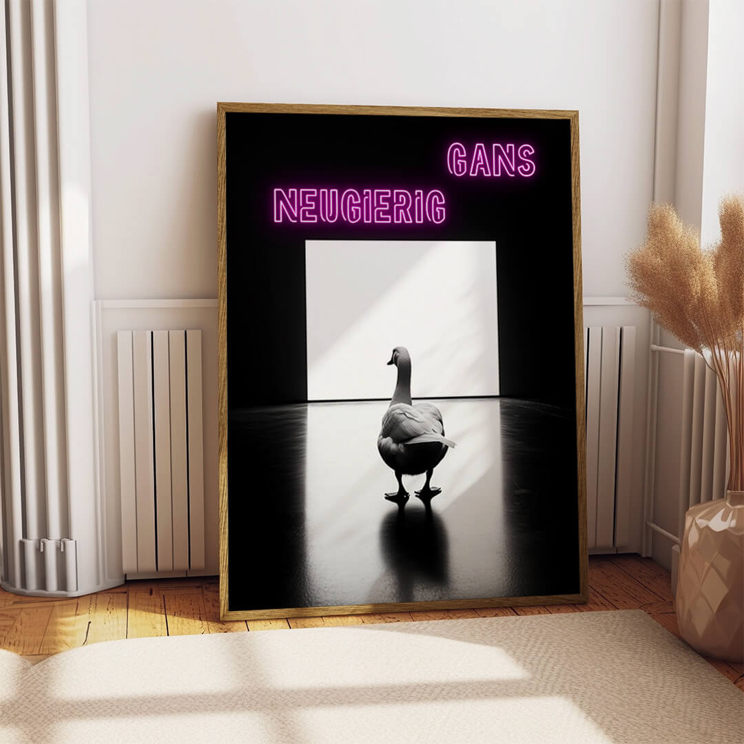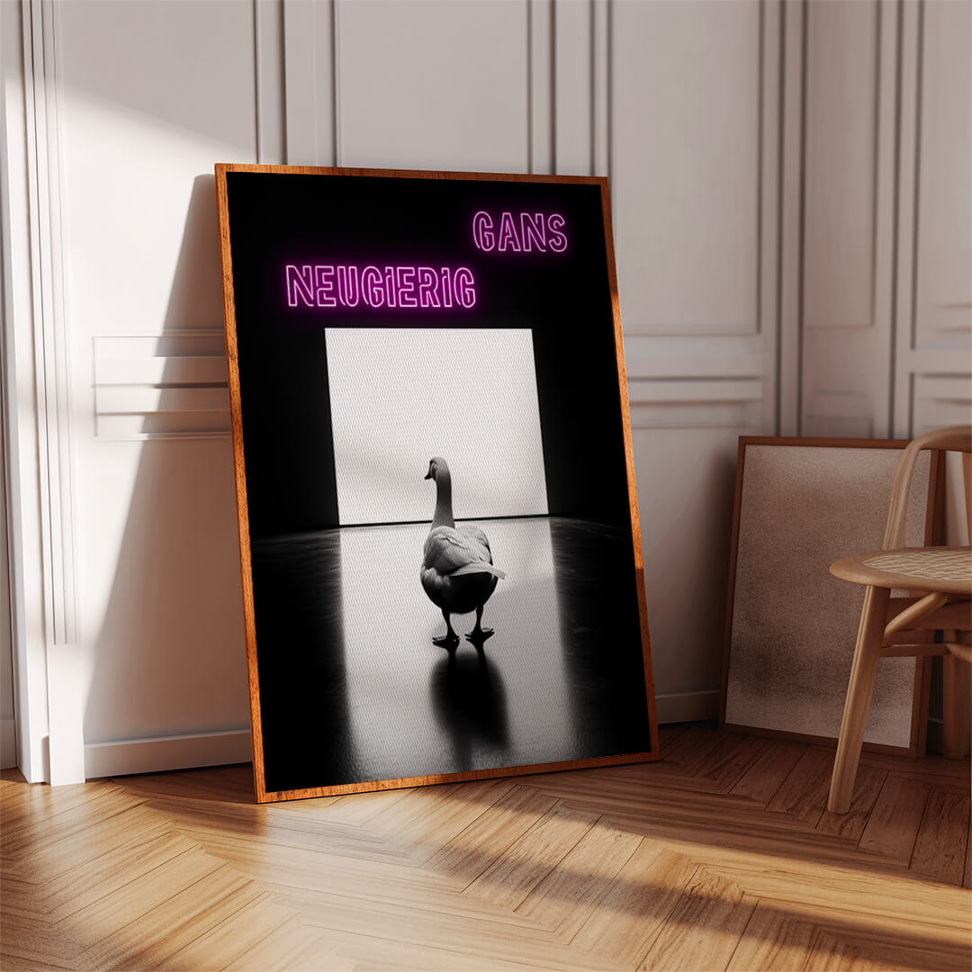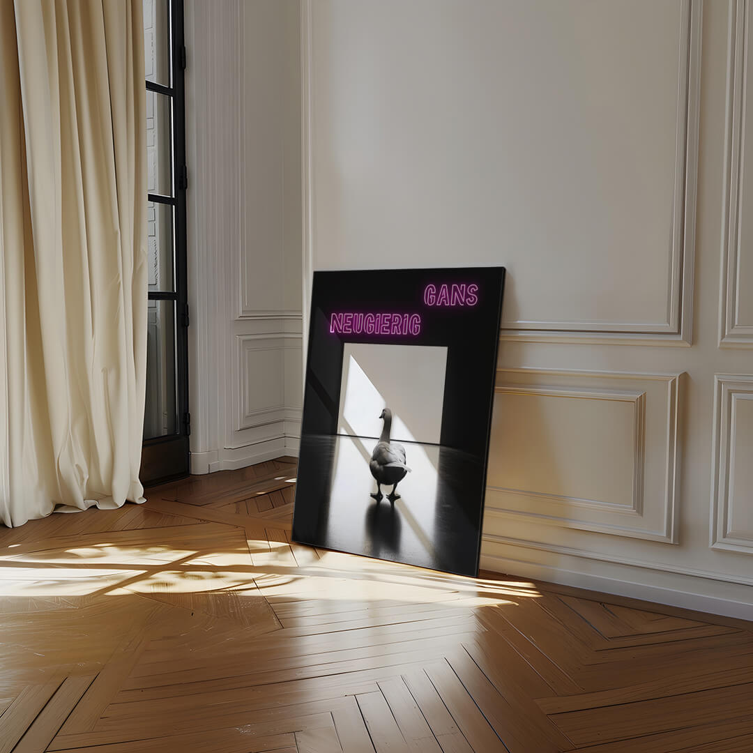 Wer wagt, gewinnt. "Gans Neugierig" zeigt den Moment, in dem Mut auf Entdeckergeist trifft. Mit Blick in das Unbekannte und bereit, einen Schritt weiterzugehen, verkörpert dieses Motiv die Essenz von Abenteuerlust.
