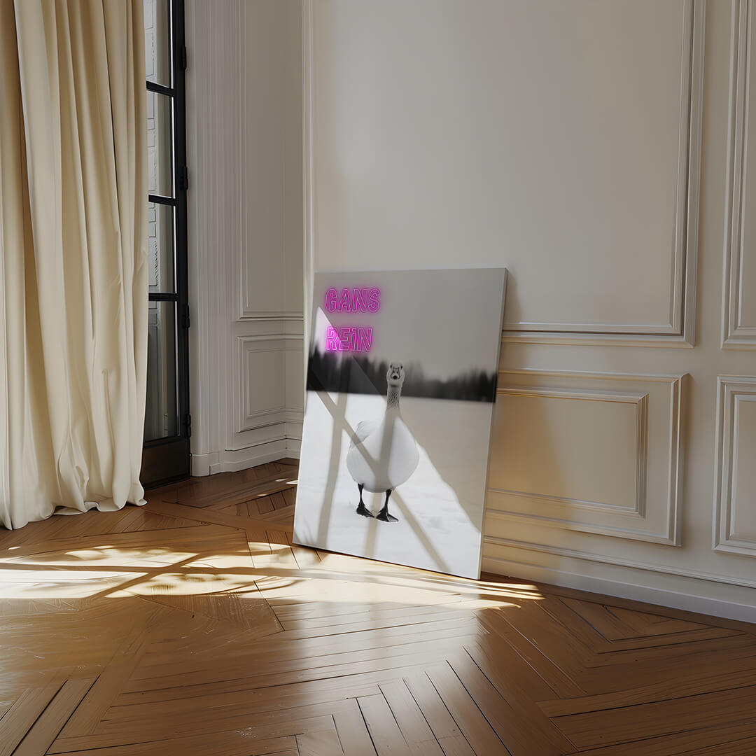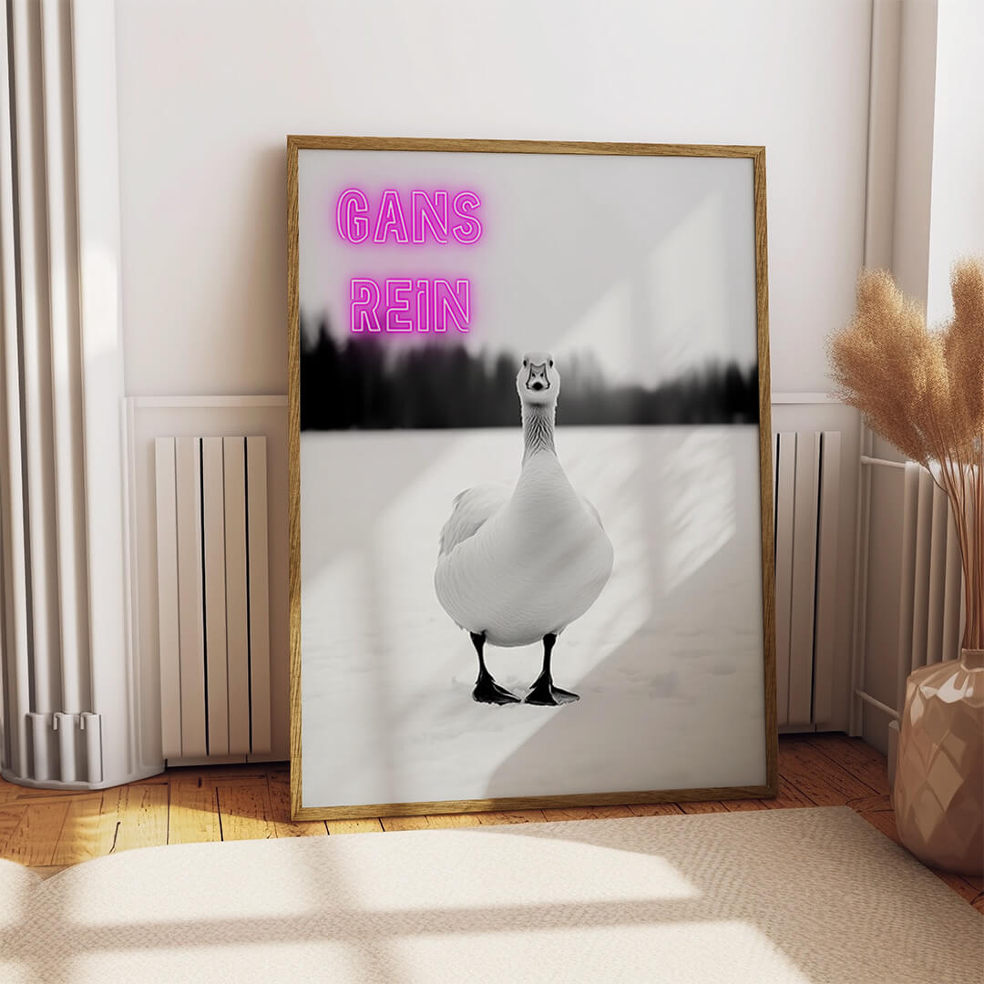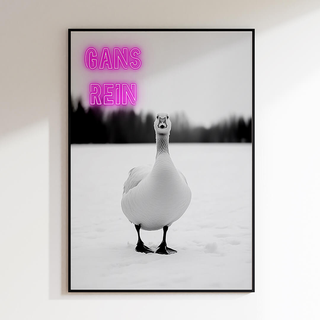 Schneeweiß, makellos und von einer Ruhe, die beeindruckt. "Gans Rein" zeigt die Gans in ihrer puren und unberührten Eleganz, umgeben von einer Winterlandschaft, die an Reinheit und Klarheit kaum zu übertreffen ist.