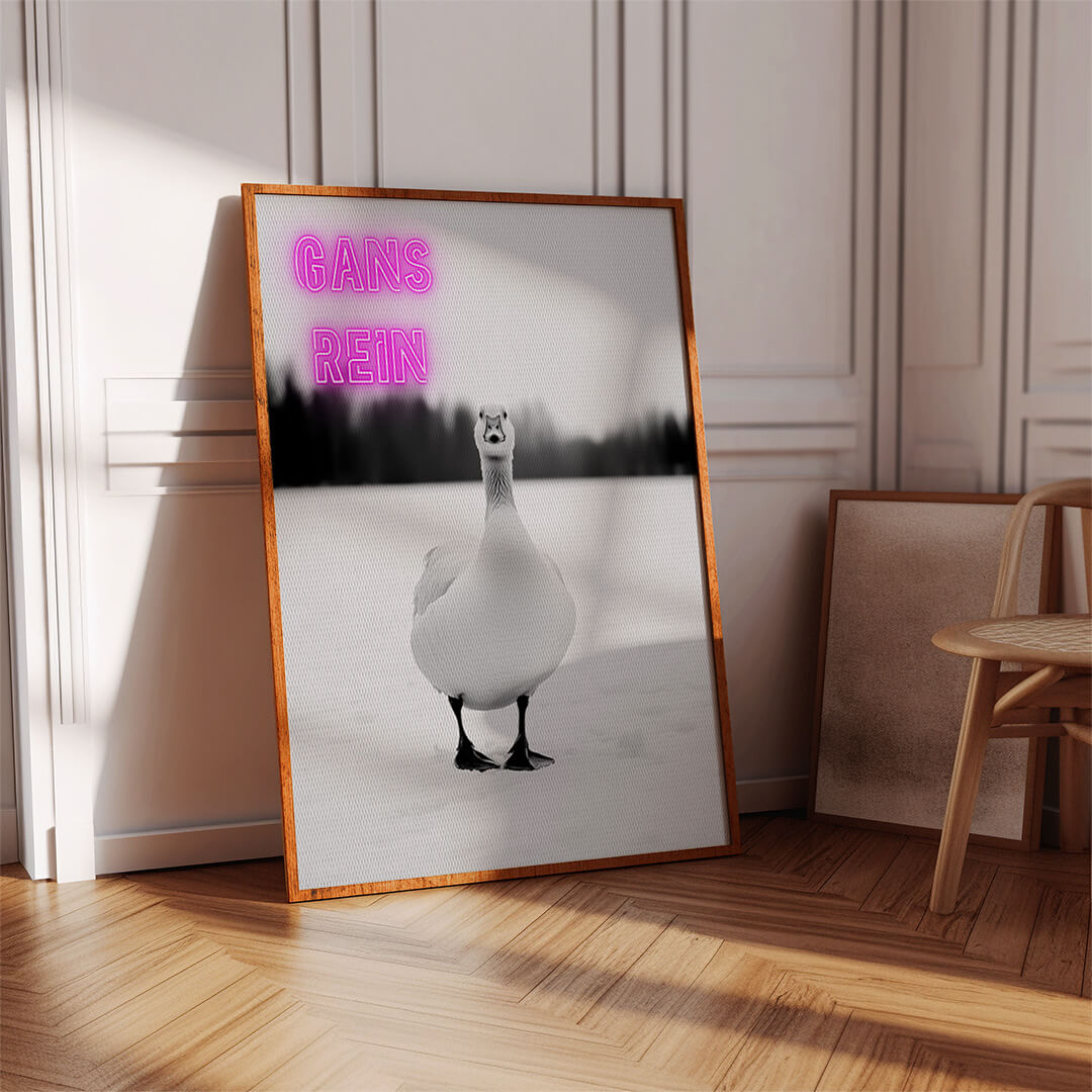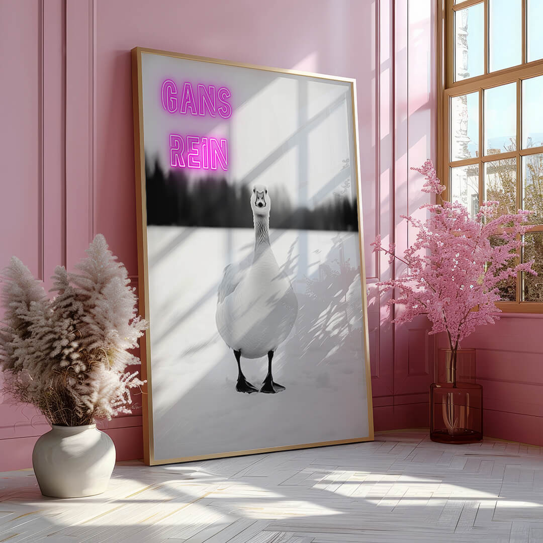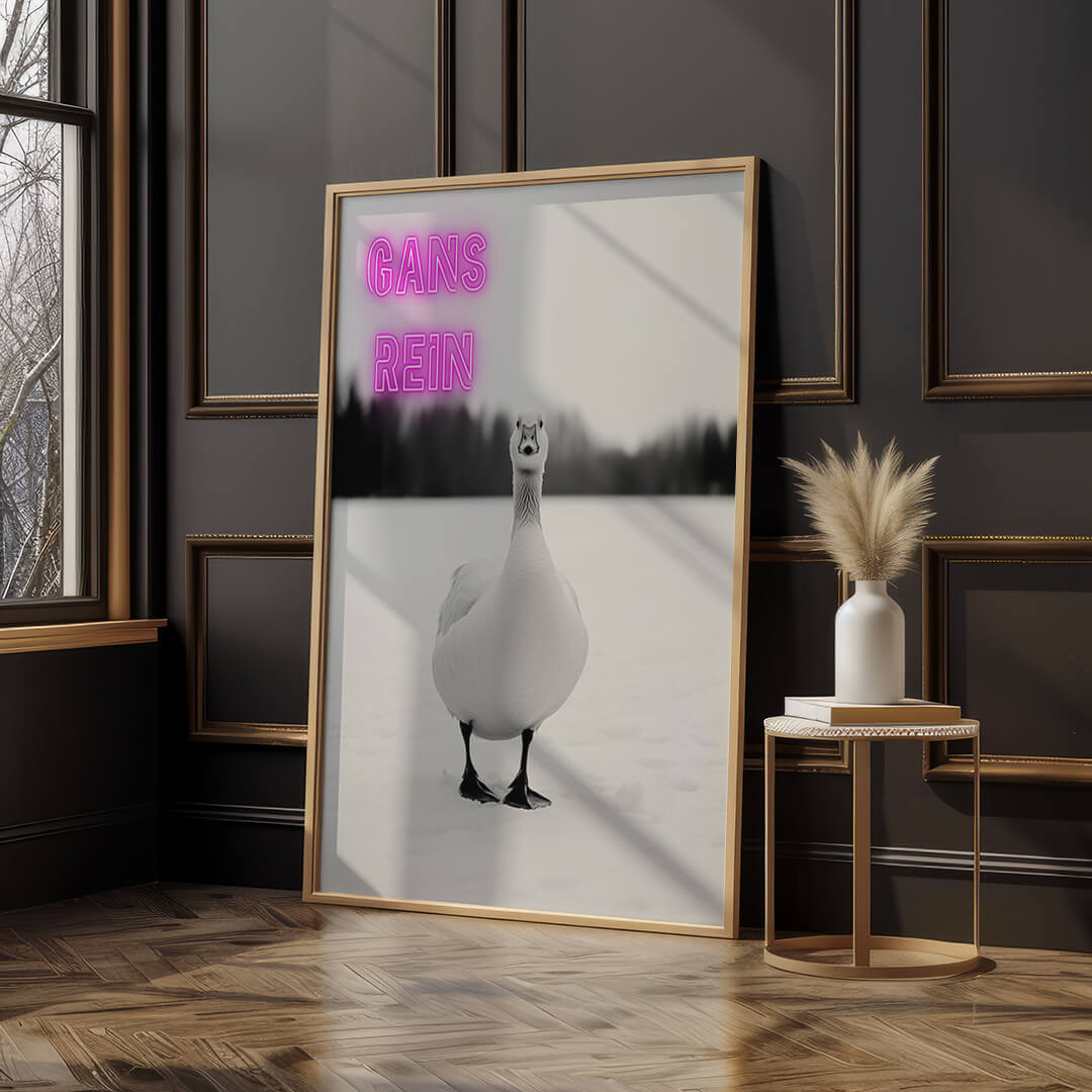 Schneeweiß, makellos und von einer Ruhe, die beeindruckt. "Gans Rein" zeigt die Gans in ihrer puren und unberührten Eleganz, umgeben von einer Winterlandschaft, die an Reinheit und Klarheit kaum zu übertreffen ist.