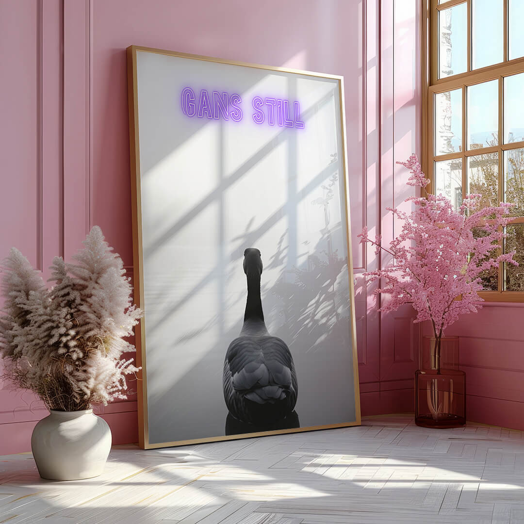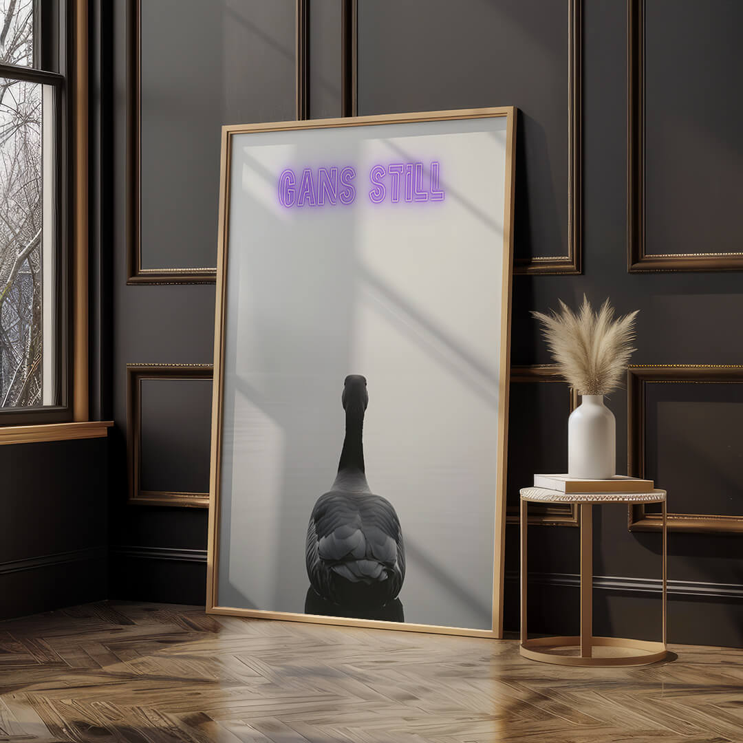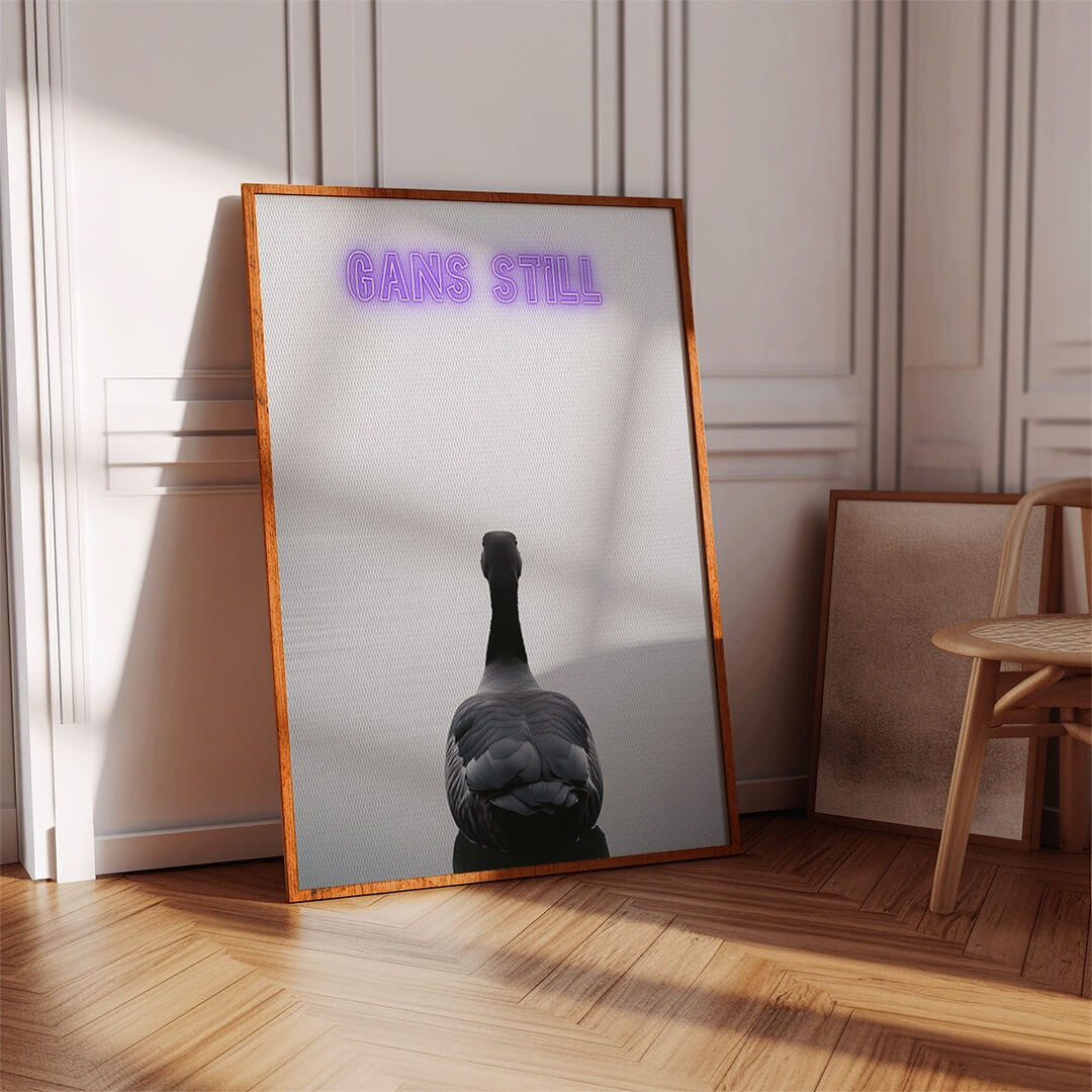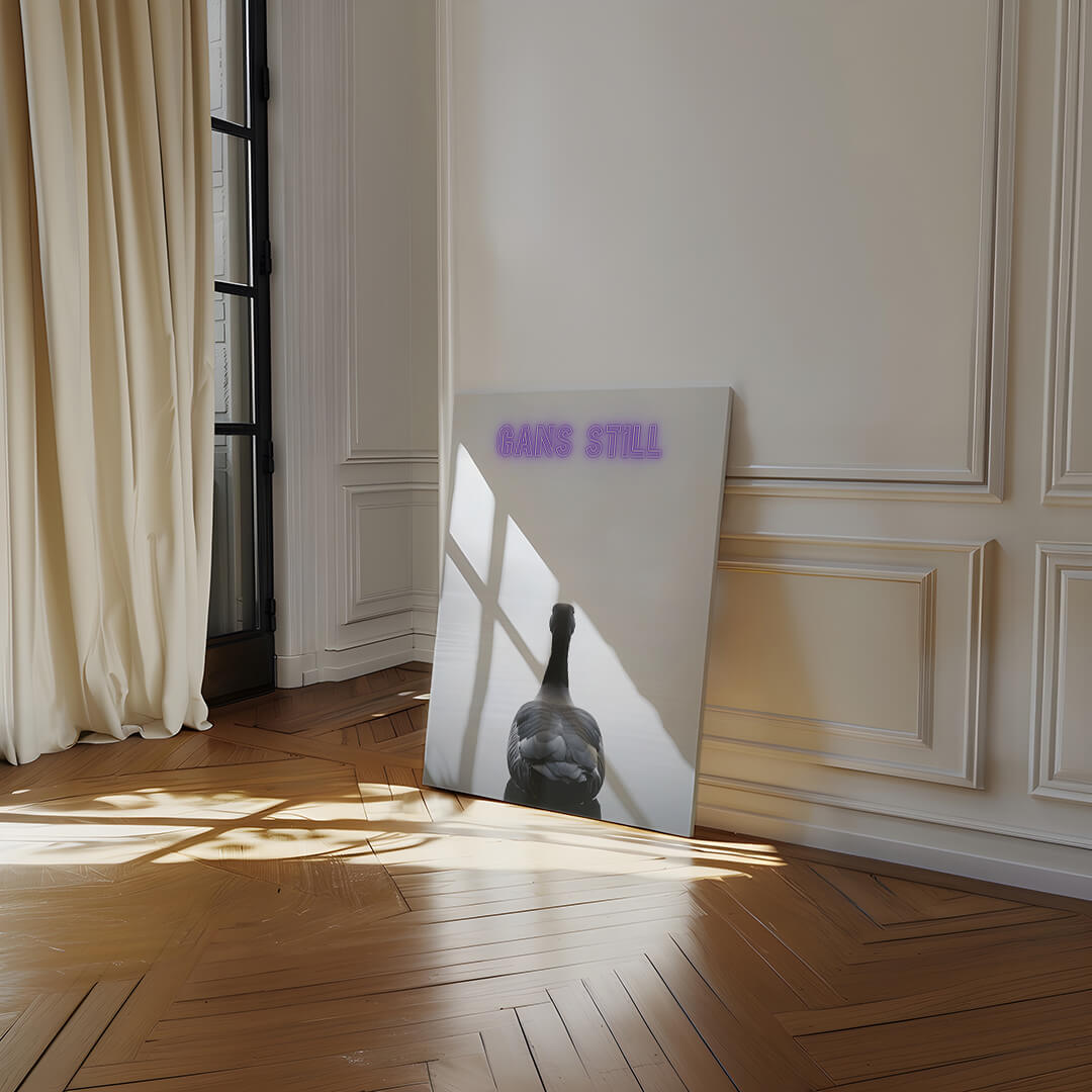 Ruhe, die unter die Haut geht. "Gans Still" fängt den Moment ein, in dem die Welt für einen Augenblick innehält. Eine Gans, allein auf spiegelglattem Wasser, umgeben von Nebel und Stille.