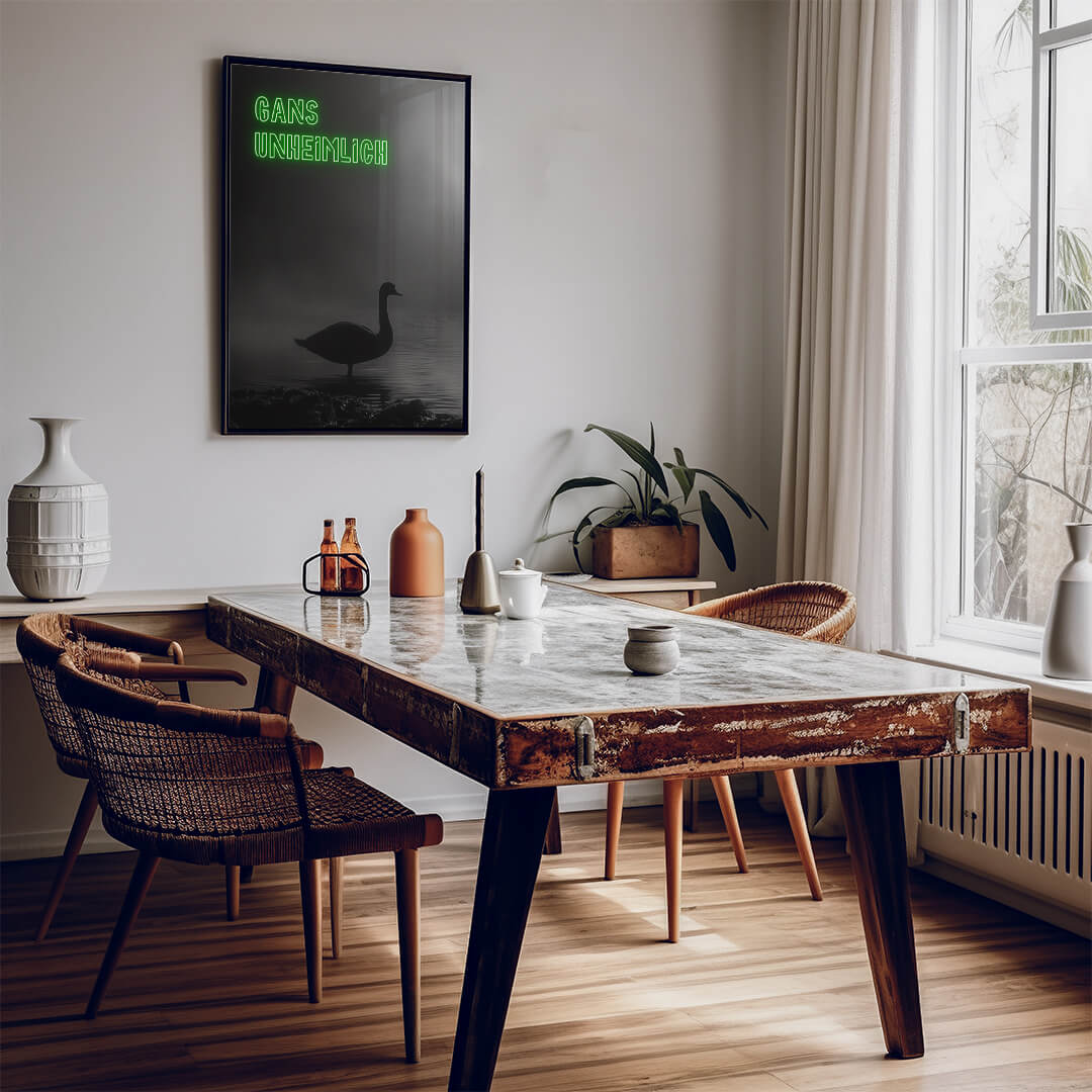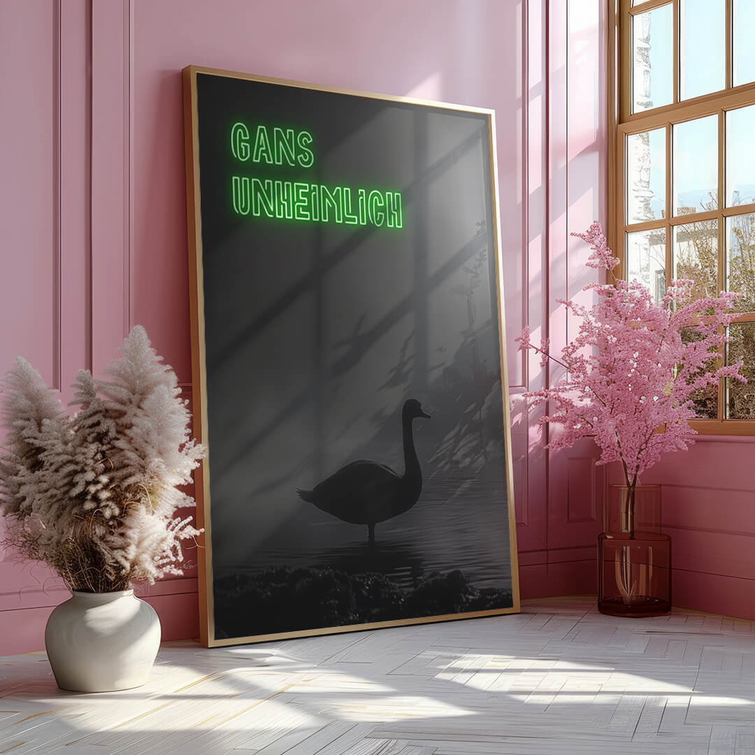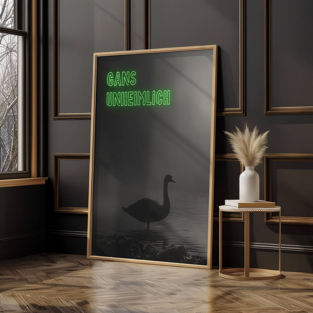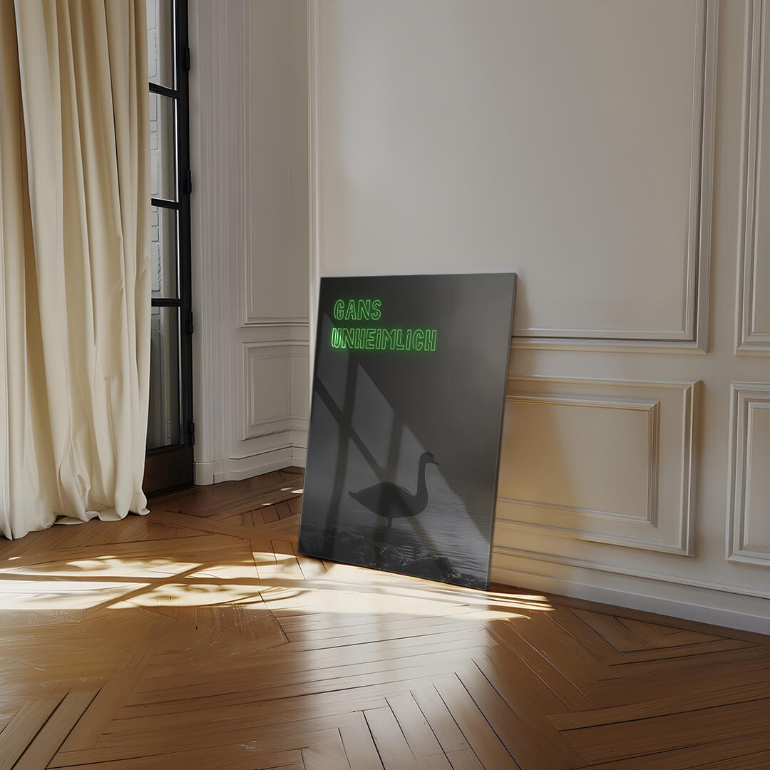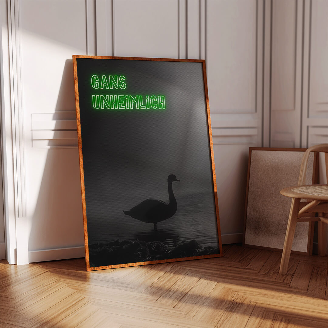 Ein Schatten im Nebel, ein Hauch von Mystik. "Gans Unheimlich" entführt in eine düstere Szenerie, die mehr Fragen aufwirft, als sie beantwortet. Die Silhouette der Gans, umgeben von geheimnisvoller Dunkelheit, schafft eine Atmosphäre, die zugleich faszinierend und fesselnd ist.