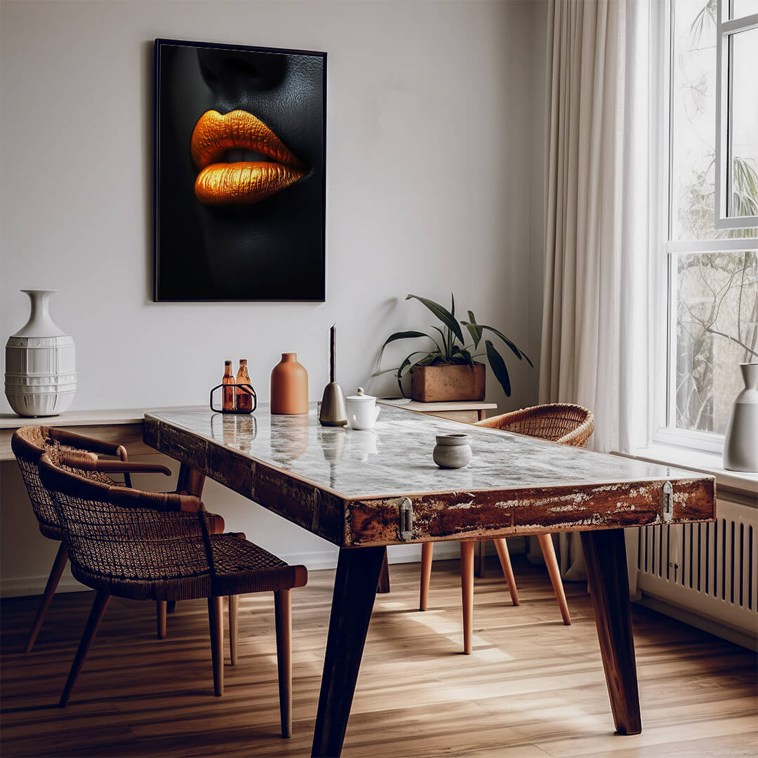 Goldene, metallisch glänzende Lippen, die auf dem tiefschwarzen Hintergrund majestätisch erstrahlen. Die kontrastreiche Darstellung und die Textur verleihen dem Bild eine luxuriöse und faszinierende Ausstrahlung, die sofort ins Auge fällt.