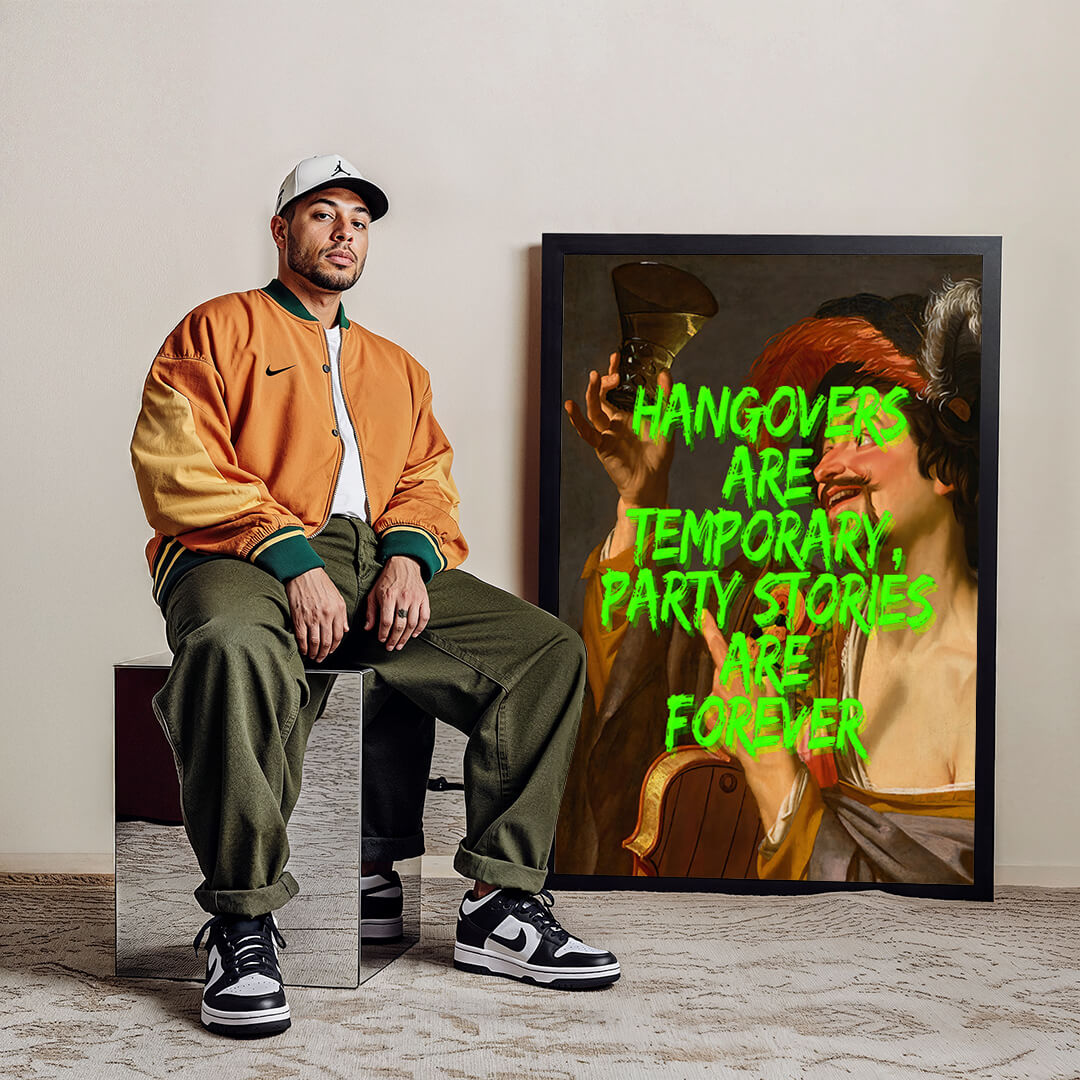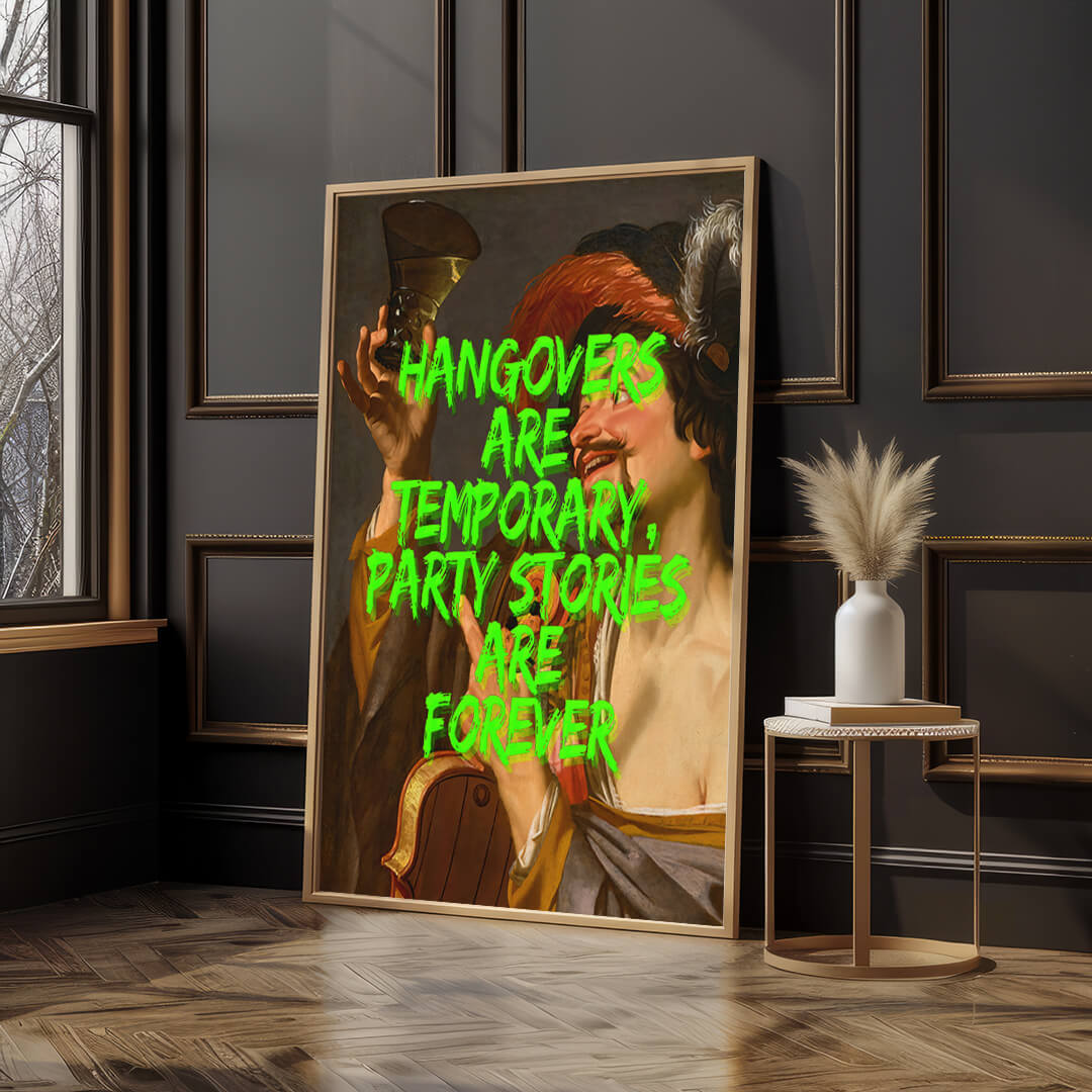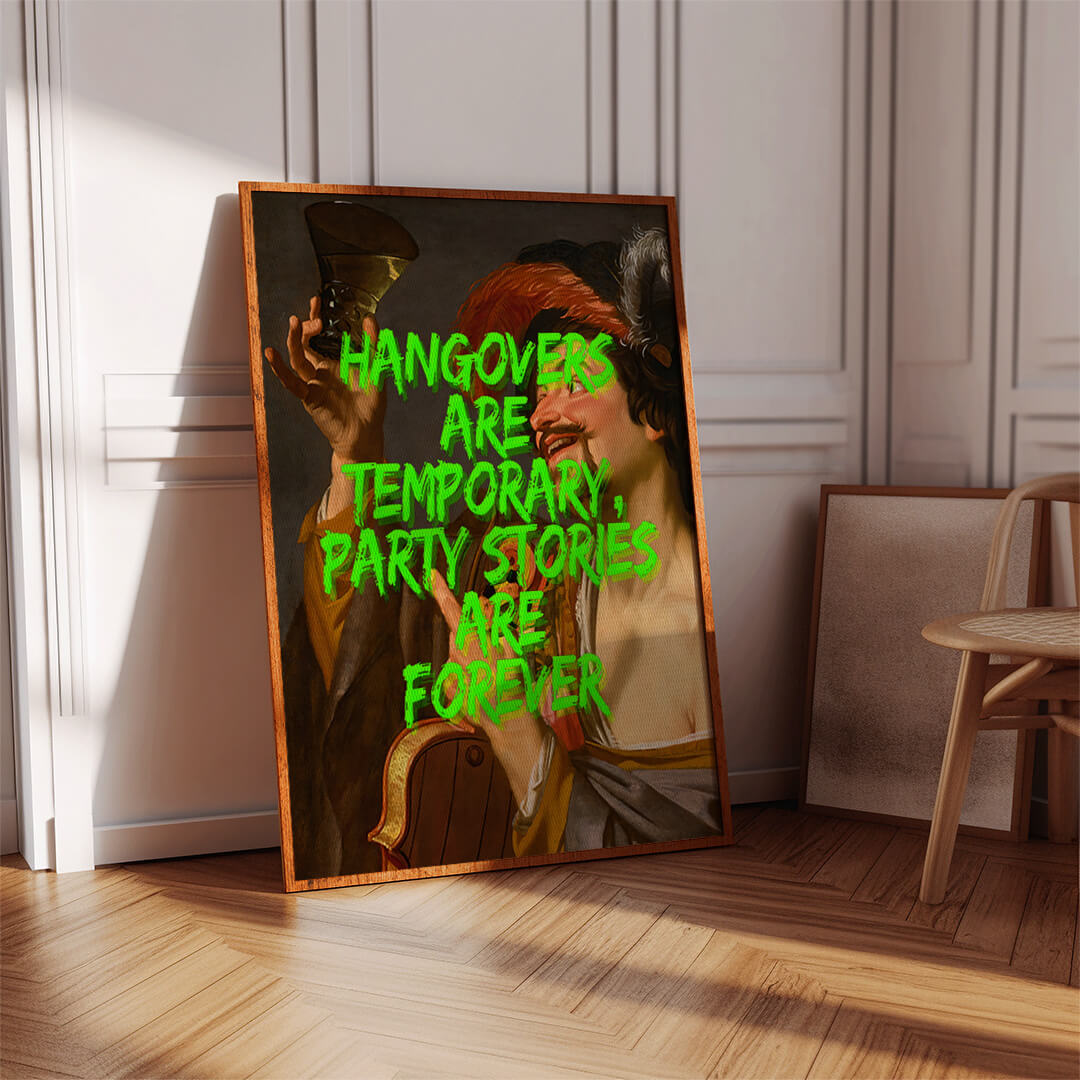 Ein Kater vergeht, aber epische Nächte bleiben für die Ewigkeit. Dieses Poster ist eine Hommage an spontane Eskalationen, an wilde Partys und an all die Erinnerungen, die vielleicht etwas verschwommen sind – aber dafür legendär.