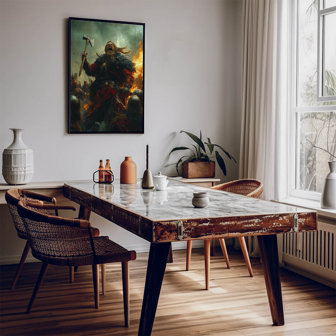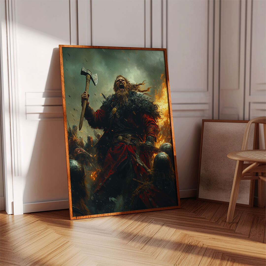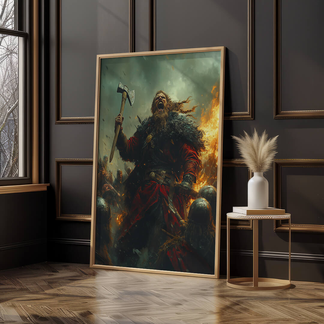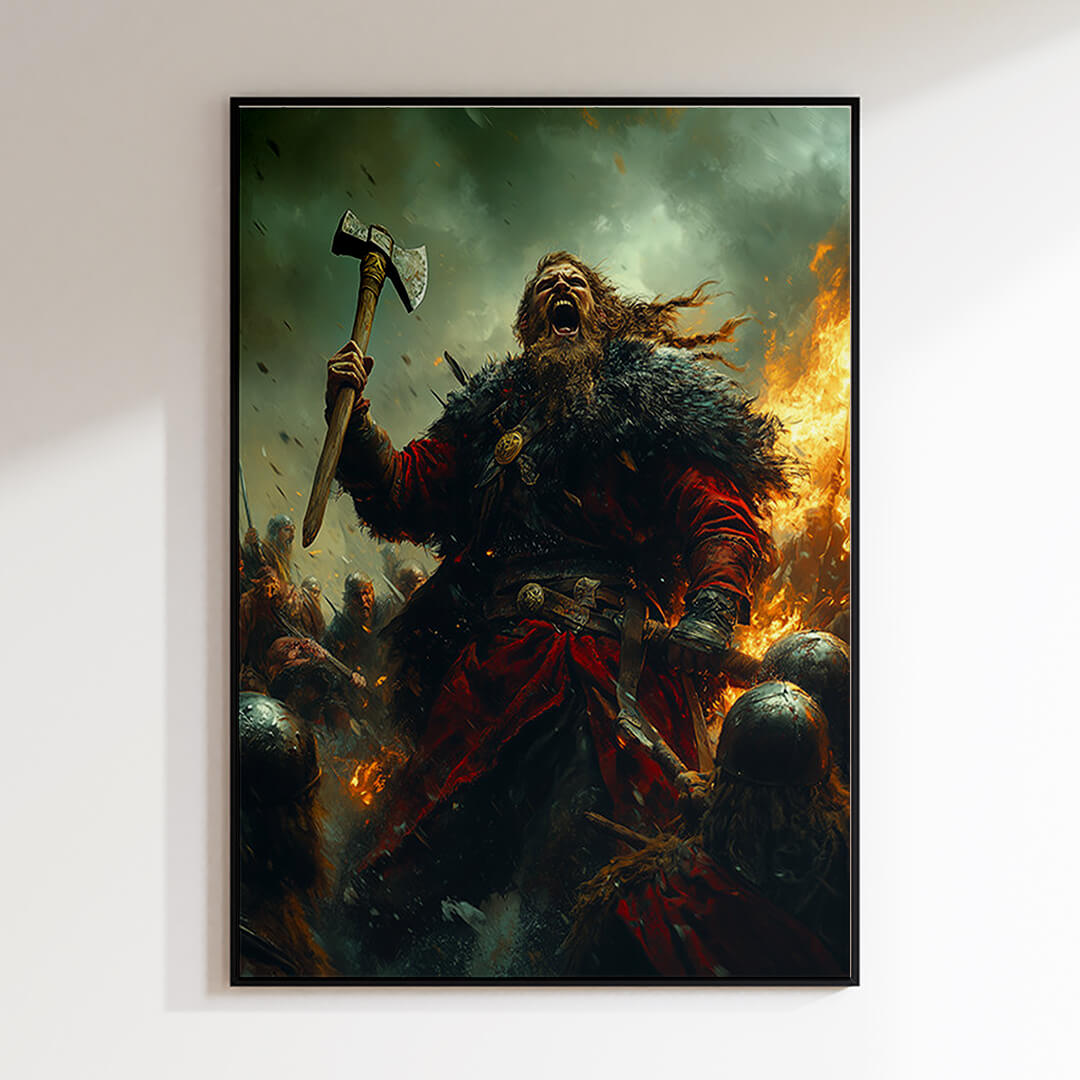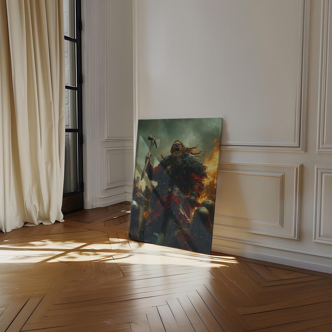 Dieses Motiv zeigt die unbezähmbare Energie eines Wikingerkriegers, der seine Männer in den Kampf führt. Der rote Mantel weht wie ein Banner der Entschlossenheit, und jeder Pinselstrich erzählt von Mut, Wut und Triumph. Dieses Bildmotiv ist für alle, die die rohe Kraft und das unaufhaltsame Feuer der Wikinger an ihrer Wand spüren wollen. Ein Bild, das nicht bittet, sondern befiehlt: Stärke zu zeigen.