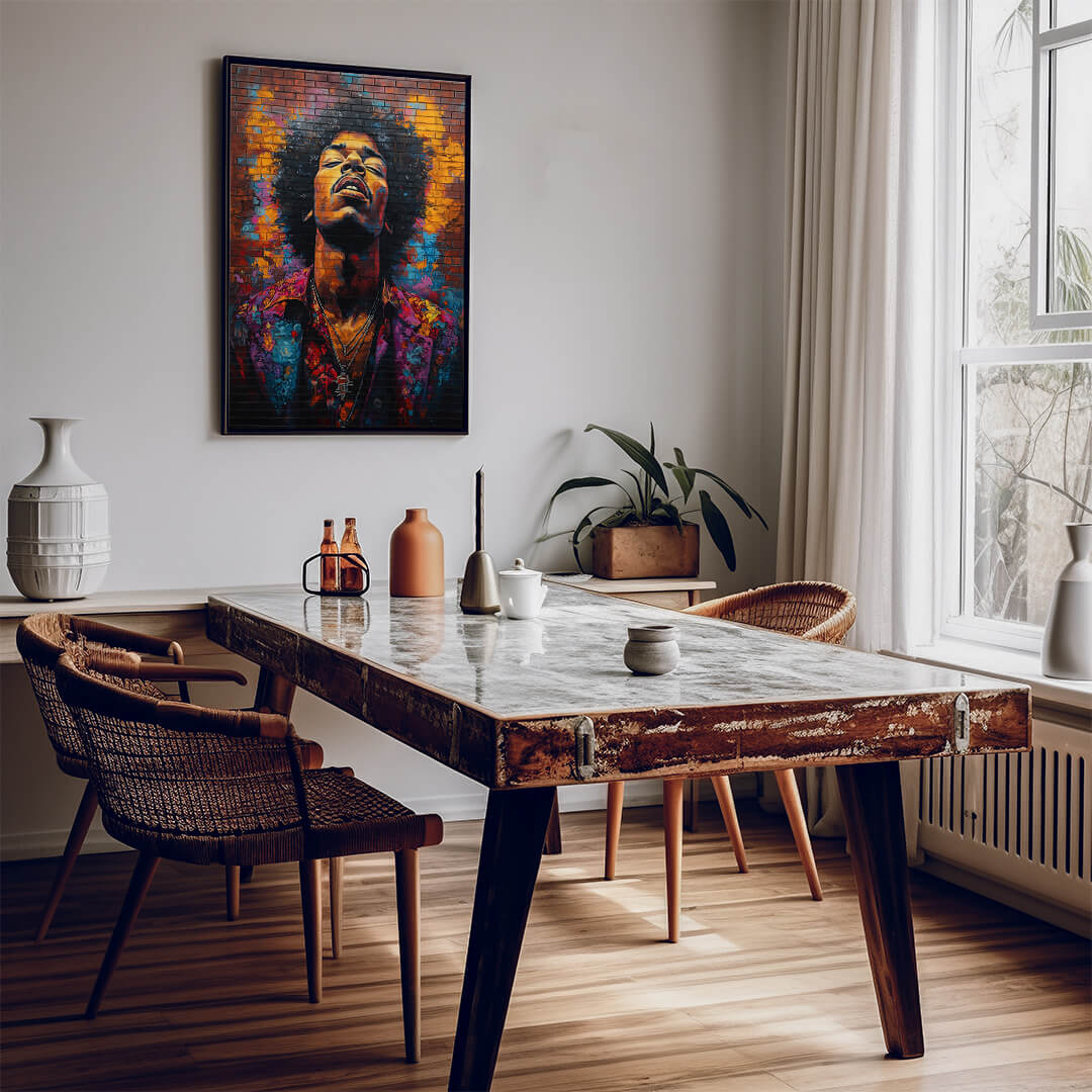 Dieses Motiv feiert die unvergessliche Legende Jimi Hendrix in all seiner Intensität und Kreativität. Mit leuchtenden Farben, die wie ein musikalisches Feuerwerk explodieren, und der rauen Struktur einer Backsteinwand wird Hendrix‘ unnachahmliche Präsenz und sein Einfluss auf die Musikgeschichte perfekt eingefangen.