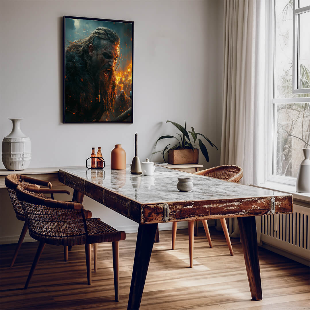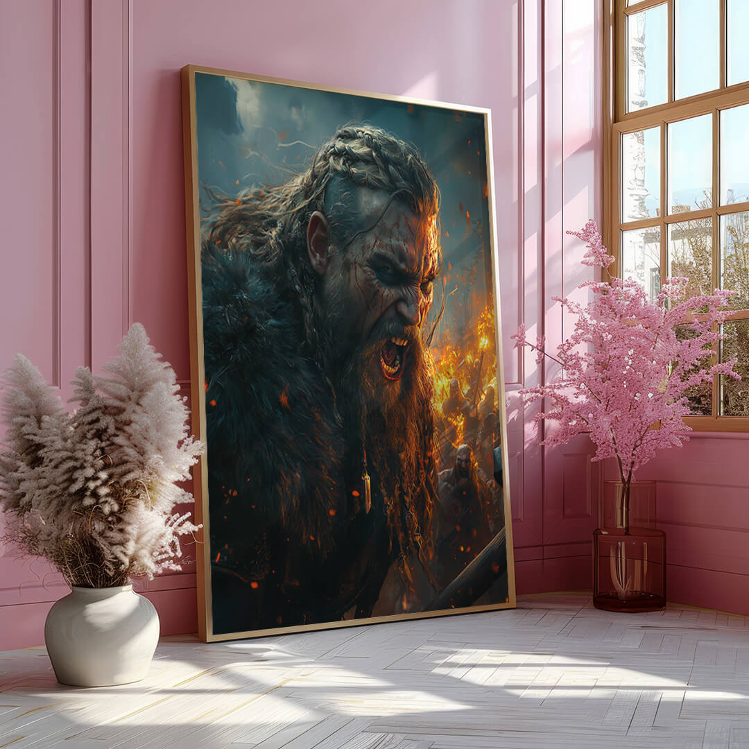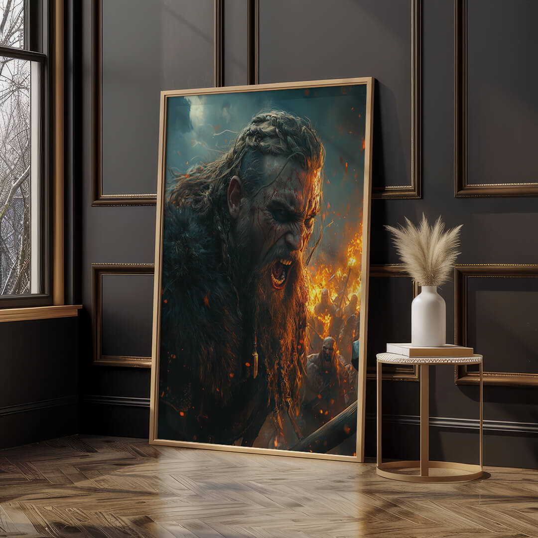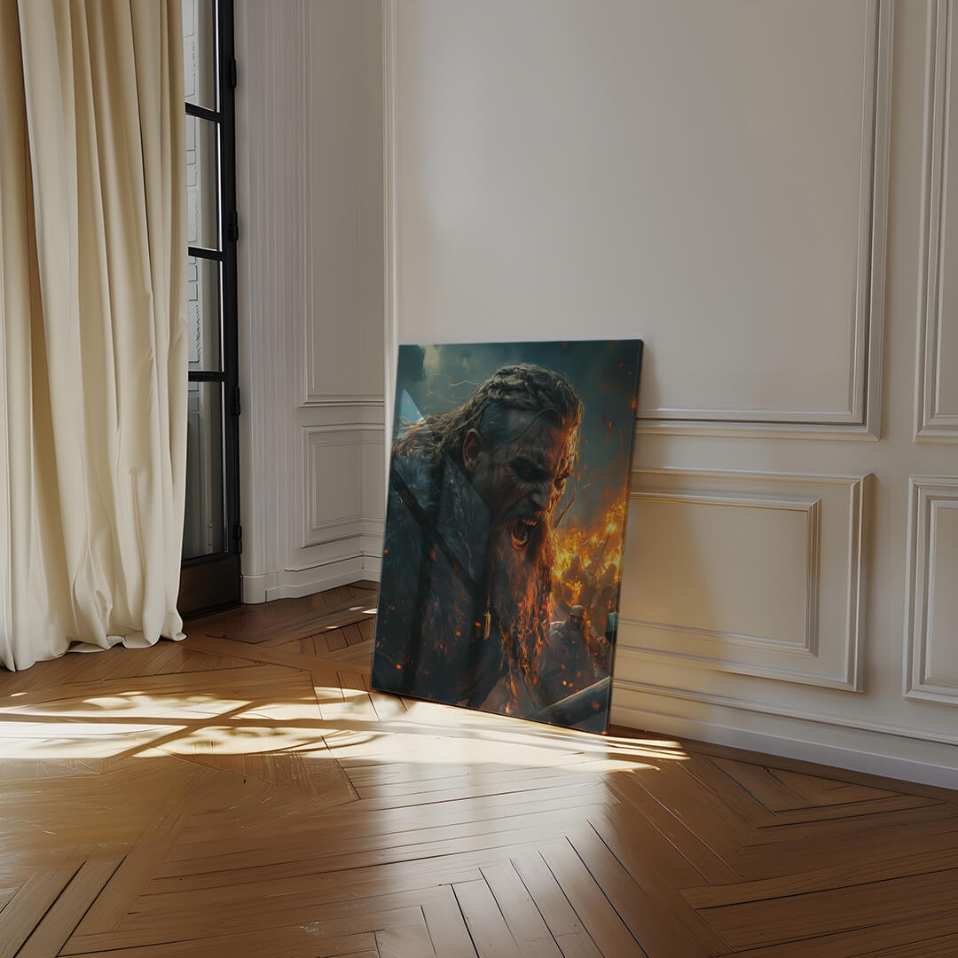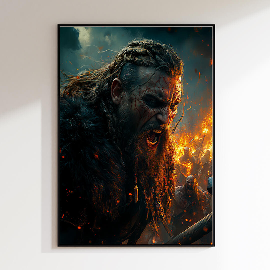 Der Schrei eines Kriegers, der alles verändert. "Kampfgeist" zeigt einen Wikingeranführer in seiner puren, wilden Entschlossenheit – das Gesicht von Kampf und Überleben, umgeben von loderndem Feuer und seinen unaufhaltsamen Gefolgsleuten. Der Blick voller Wut, das Feuer der Schlacht spiegelt sich in seinen Augen wider. Dieses Motiv zieht Dich mitten hinein ins Chaos und lässt dich die Energie und Wildheit der Wikinger spüren.