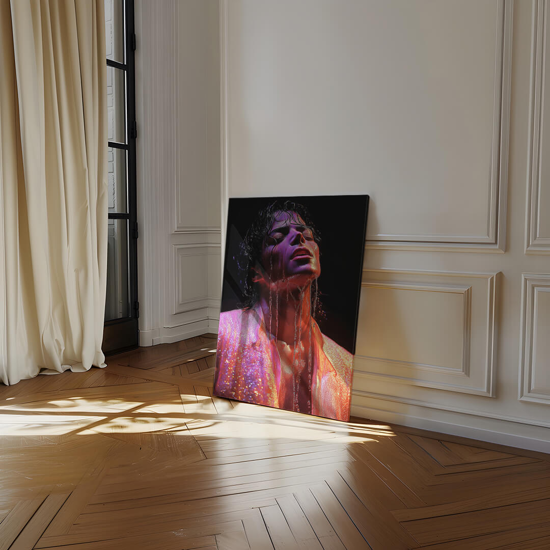 Dieses ausdrucksstarke Kunstwerk zeigt die Musik-Ikone Michael Jackson in einem Moment intensiver Emotion und Hingabe. Die brillante Lichtgestaltung und die kraftvolle Pose bringen die einzigartige Ausstrahlung des „King of Pop“ perfekt zur Geltung. Die Kombination aus schimmernden Farben und feinen Details fängt Jacksons legendäre Bühnenpräsenz ein und macht dieses Bild zu einem beeindruckenden Statement-Piece.