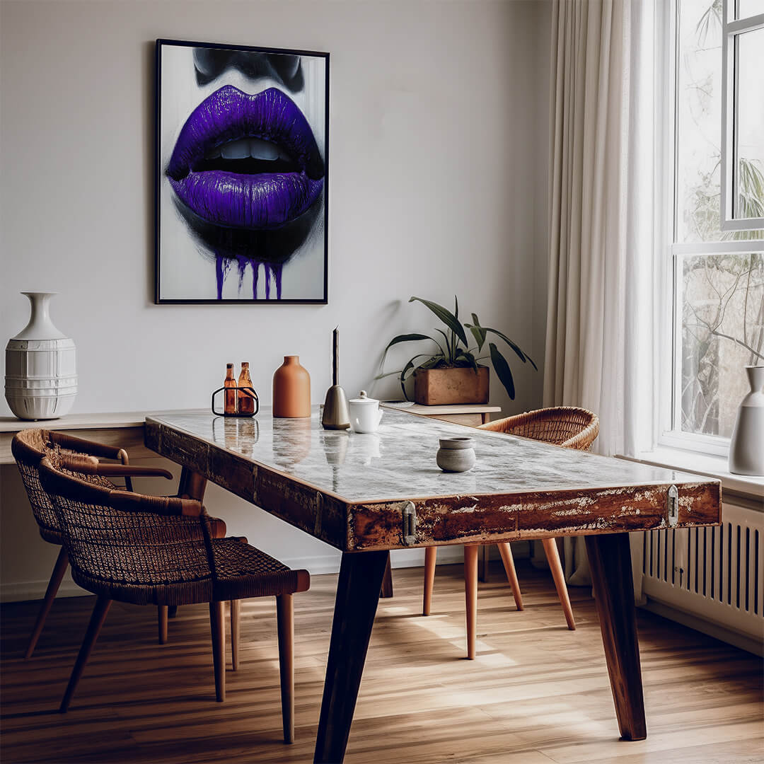 Dieses dramatische Motiv mit tiefvioletten, glänzenden Lippen fängt die Essenz von Eleganz und Mystik ein. Die intensiv schimmernde Farbe und die tropfenden Details verleihen dem Bild eine einzigartige, fast surreal wirkende Tiefe, die sofort ins Auge sticht.