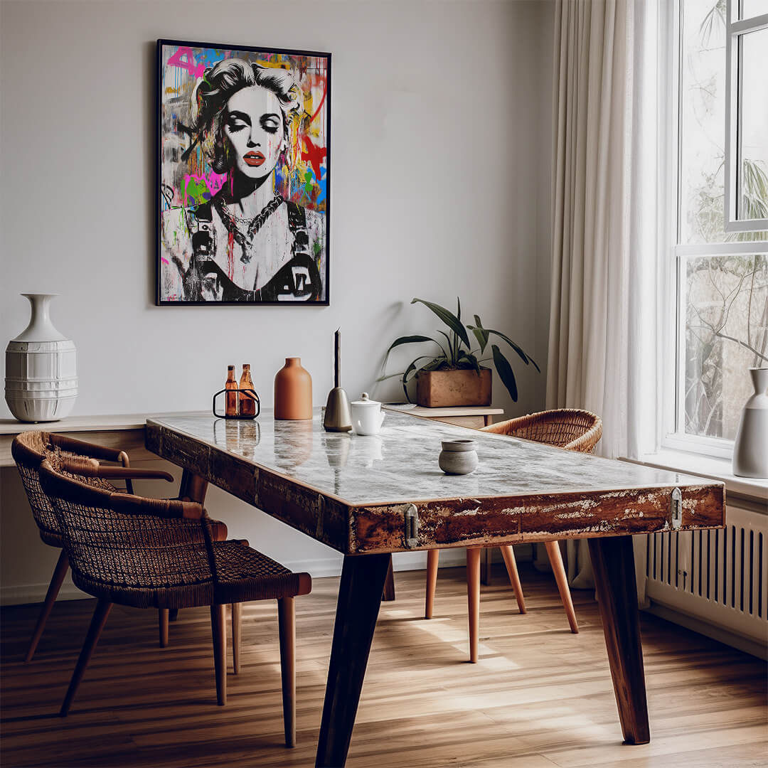 Dieses kunstvolle Porträt von Madonna vereint den rebellischen Geist der Popkultur mit einem modernen Street-Art-Stil. Die ikonische Sängerin wird hier in lebhaften Farben und dynamischen Pinselstrichen dargestellt, die ihre Einzigartigkeit und ihren Einfluss auf die Musikwelt eindrucksvoll hervorheben. Das Zusammenspiel aus monochromatischen Elementen und knalligen Farbdetails verleiht dem Bild eine kraftvolle Ausstrahlung und macht es zu einem markanten Blickfang.