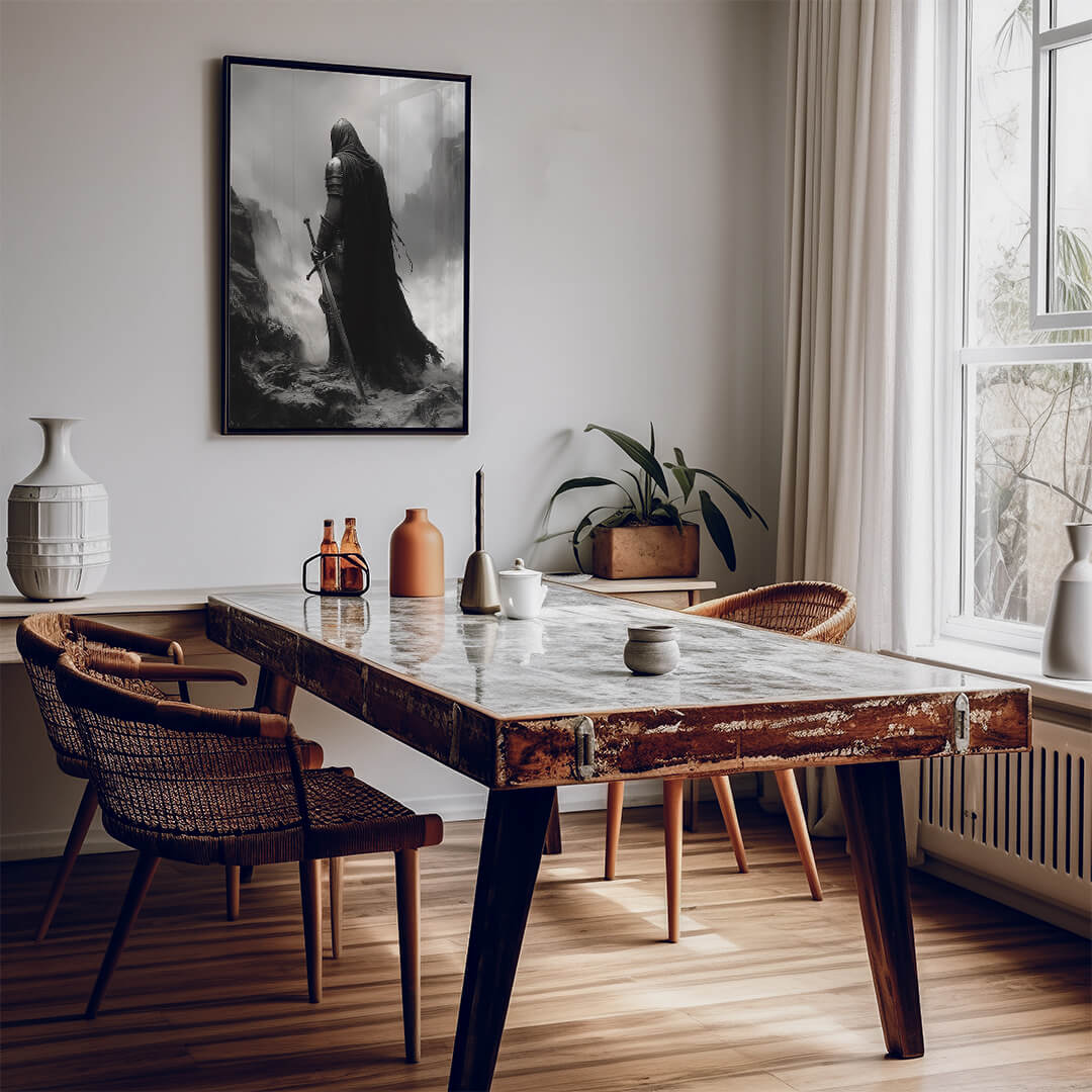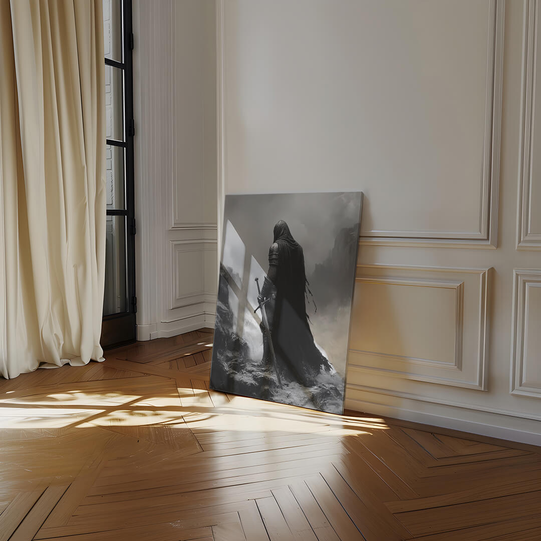 Die monochrome Ästhetik und die dramatische Atmosphäre machen dieses Motiv zu einem kraftvollen Symbol für Mut und Entschlossenheit. Perfekt für alle, die Geschichte, Stärke und epische Kunst in ihre Räume bringen wollen.