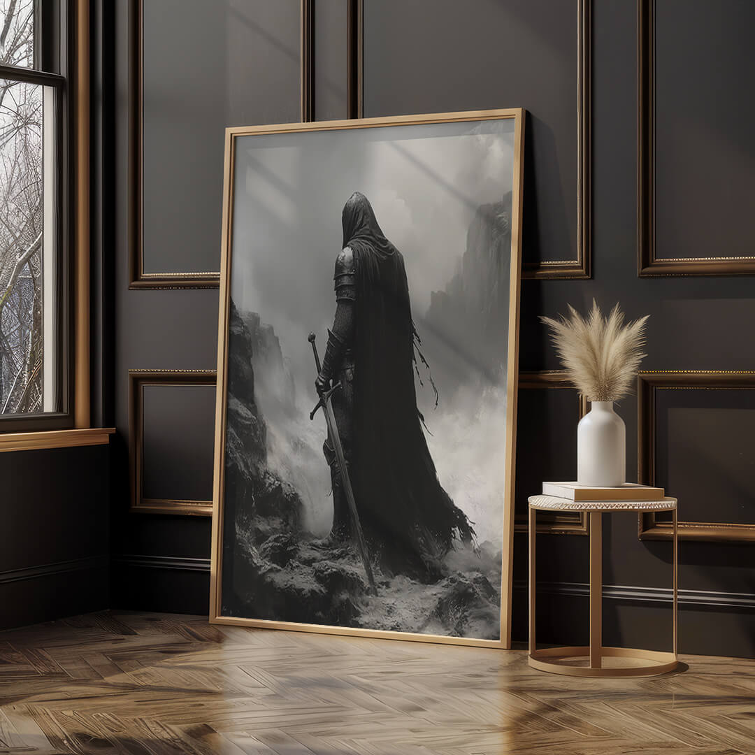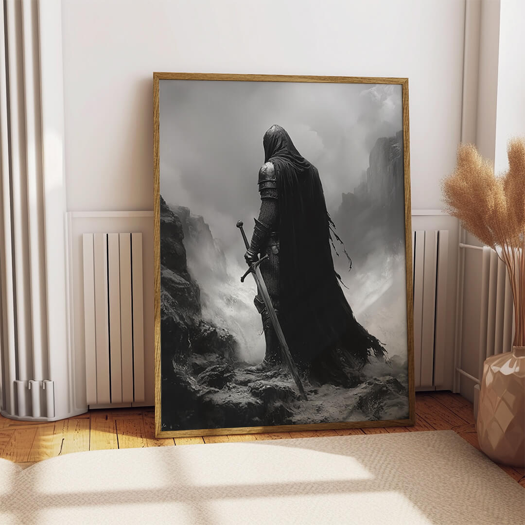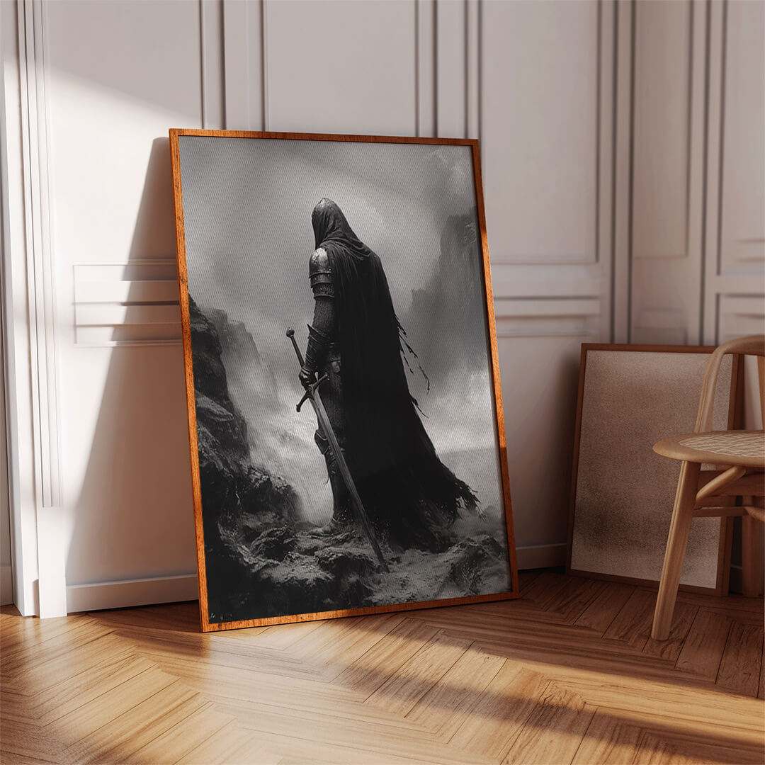 Einsam, unerschütterlich, bereit. Der "Medieval Knight" steht vor einer stürmischen Kulisse, das Schwert in der Hand, der Blick in die Weite gerichtet. Dieses Motiv fängt die stille Stärke und den unbeugsamen Geist eines Kriegers ein, der sich den Herausforderungen stellt – egal wie düster die Zeiten sind.