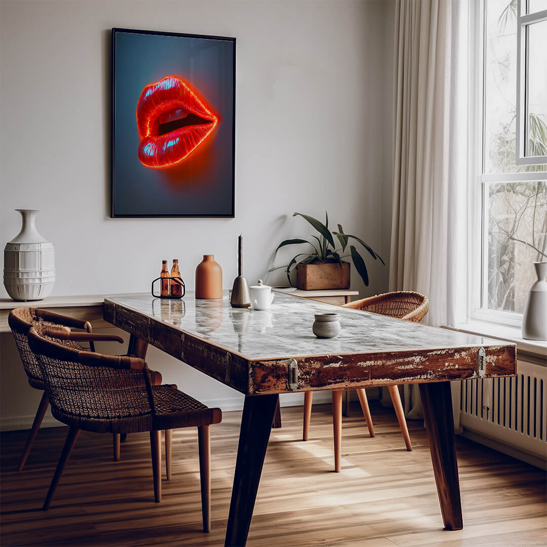 Dieses knallige Neon-Motiv mit glänzenden, roten Lippen setzt ein kraftvolles Statement und zieht alle Blicke auf sich. Die intensive Farbgebung und der futuristische Glanz verleihen dem Bild eine einzigartige, fast hypnotische Ausstrahlung, die jedem Raum eine moderne und stilvolle Note verleiht.