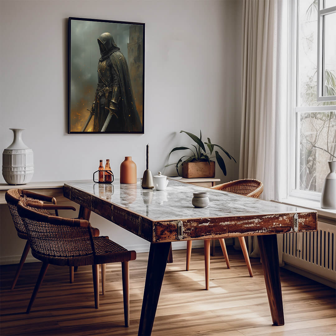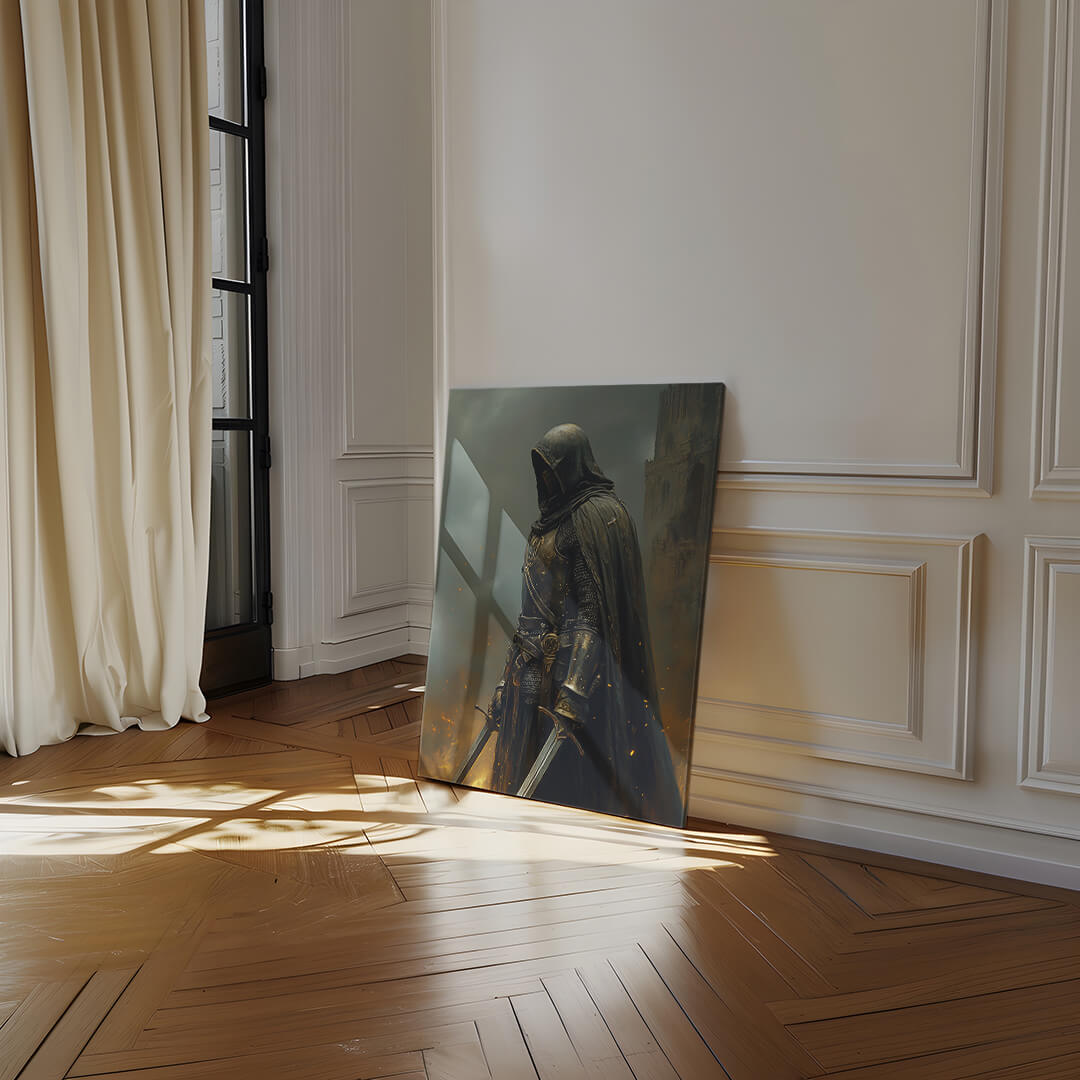 Mit zwei Schwertern in den Händen und einem unerschütterlichen Blick verkörpert "The Knight" die Essenz von Stärke und Ehre. Die glühenden Funken, der finstere Himmel und die düstere Silhouette eines zerstörten Turms schaffen eine dramatische Szenerie, die den Geist eines wahren Kriegers einfängt.