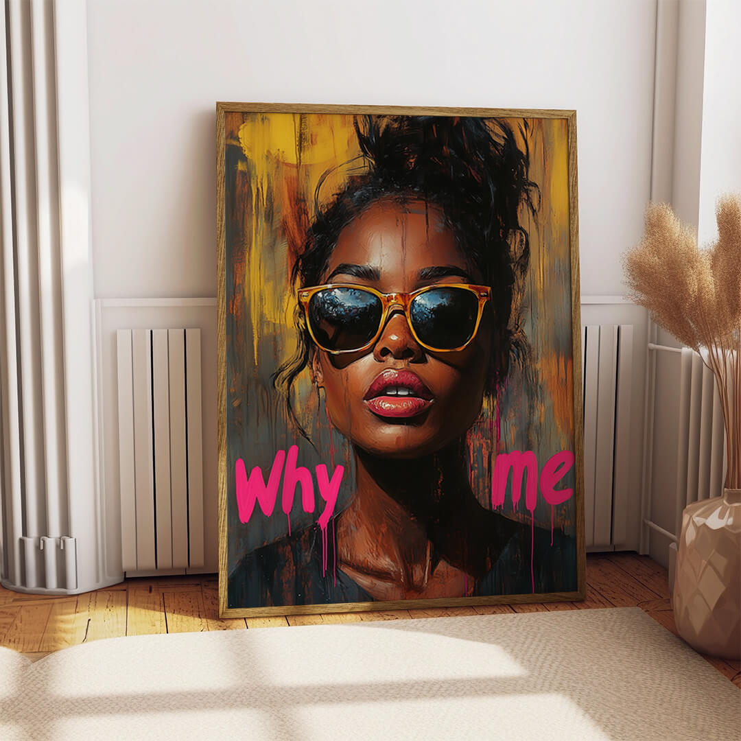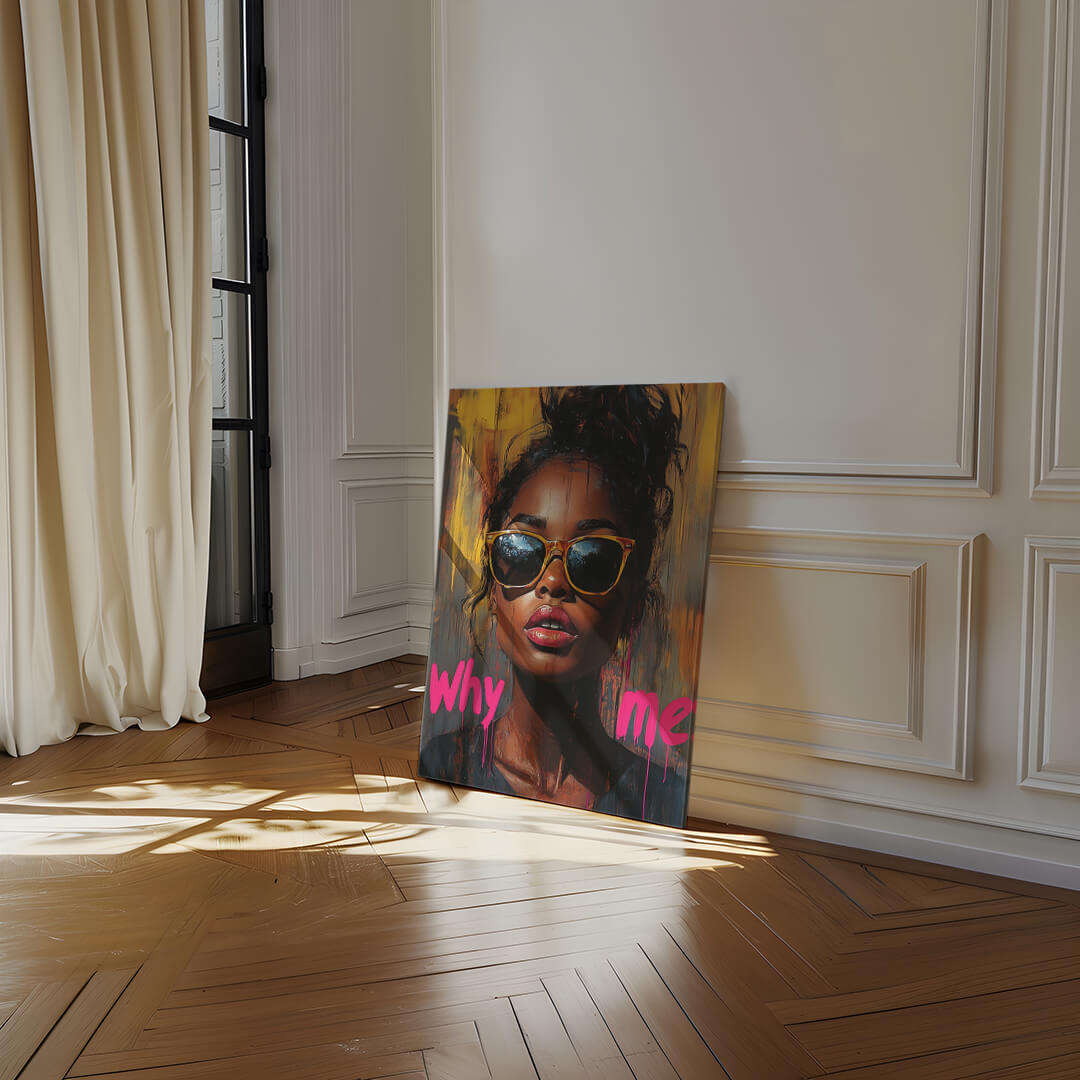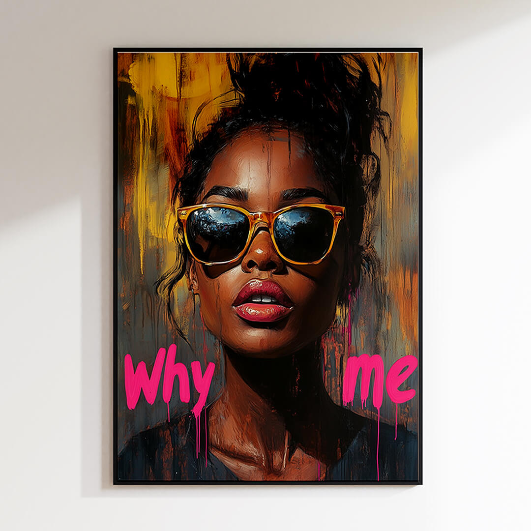 Du suchst urbane Ästhetik mit einer kraftvollen Botschaft? Die lebendigen Farben, kombiniert mit der markanten Figur und dem provokanten Schriftzug „Why me“, erzeugen eine intensive emotionale Wirkung.