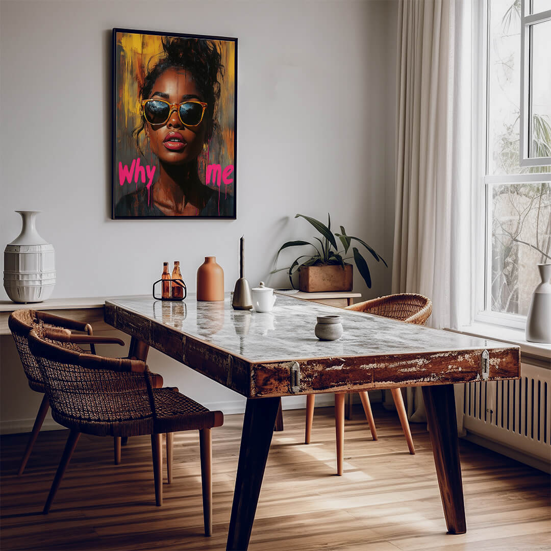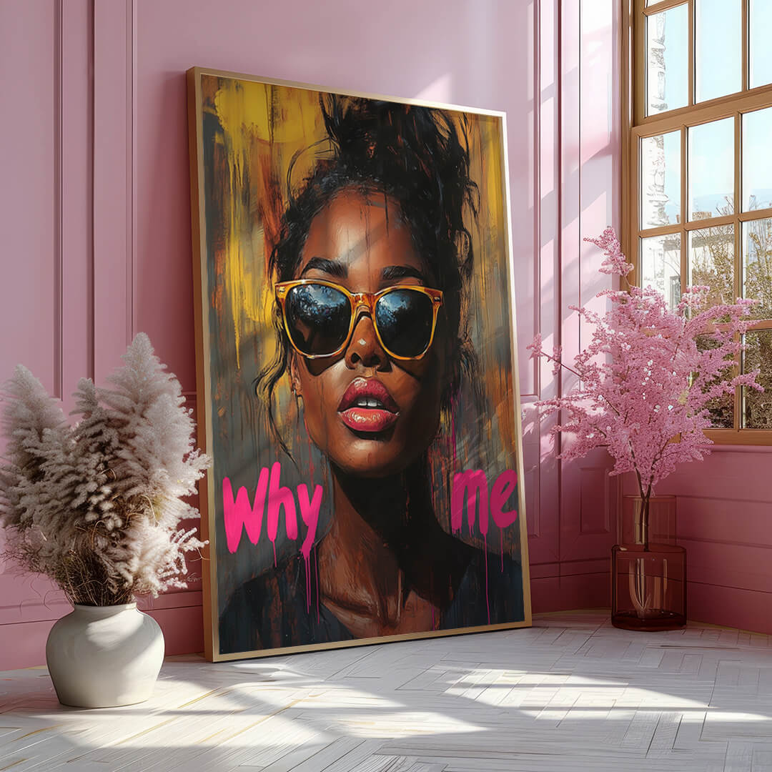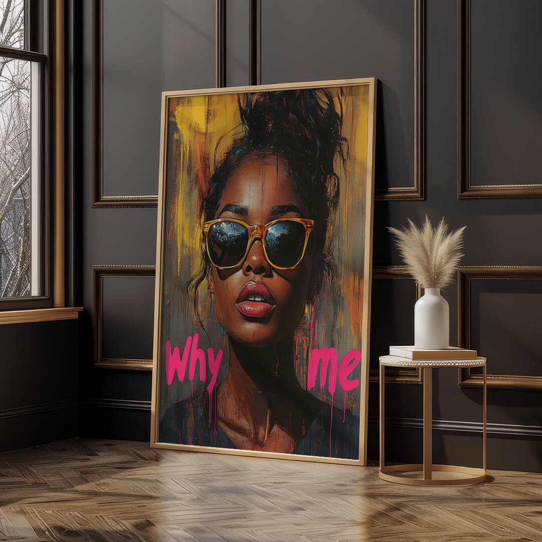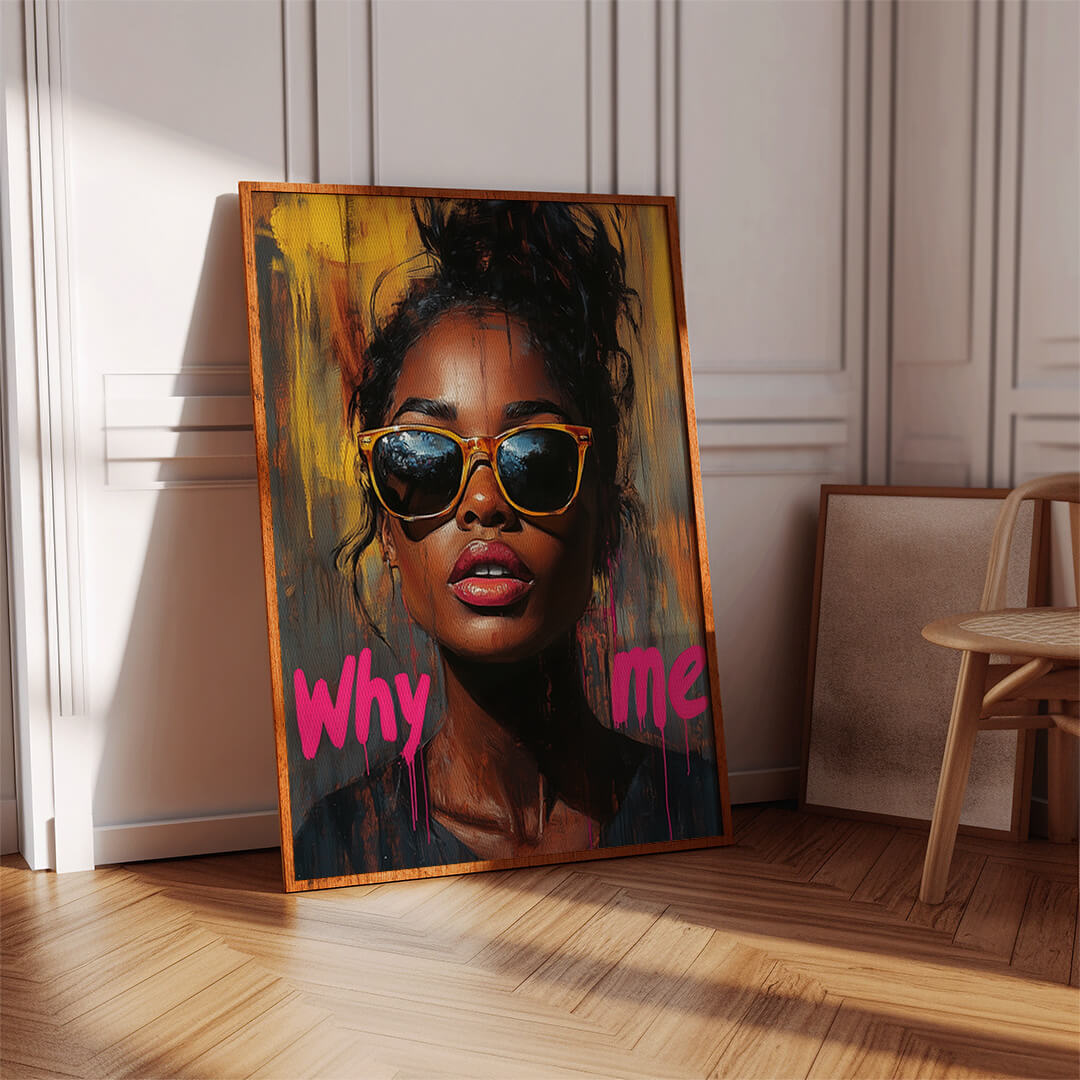 Du suchst urbane Ästhetik mit einer kraftvollen Botschaft? Die lebendigen Farben, kombiniert mit der markanten Figur und dem provokanten Schriftzug „Why me“, erzeugen eine intensive emotionale Wirkung.
